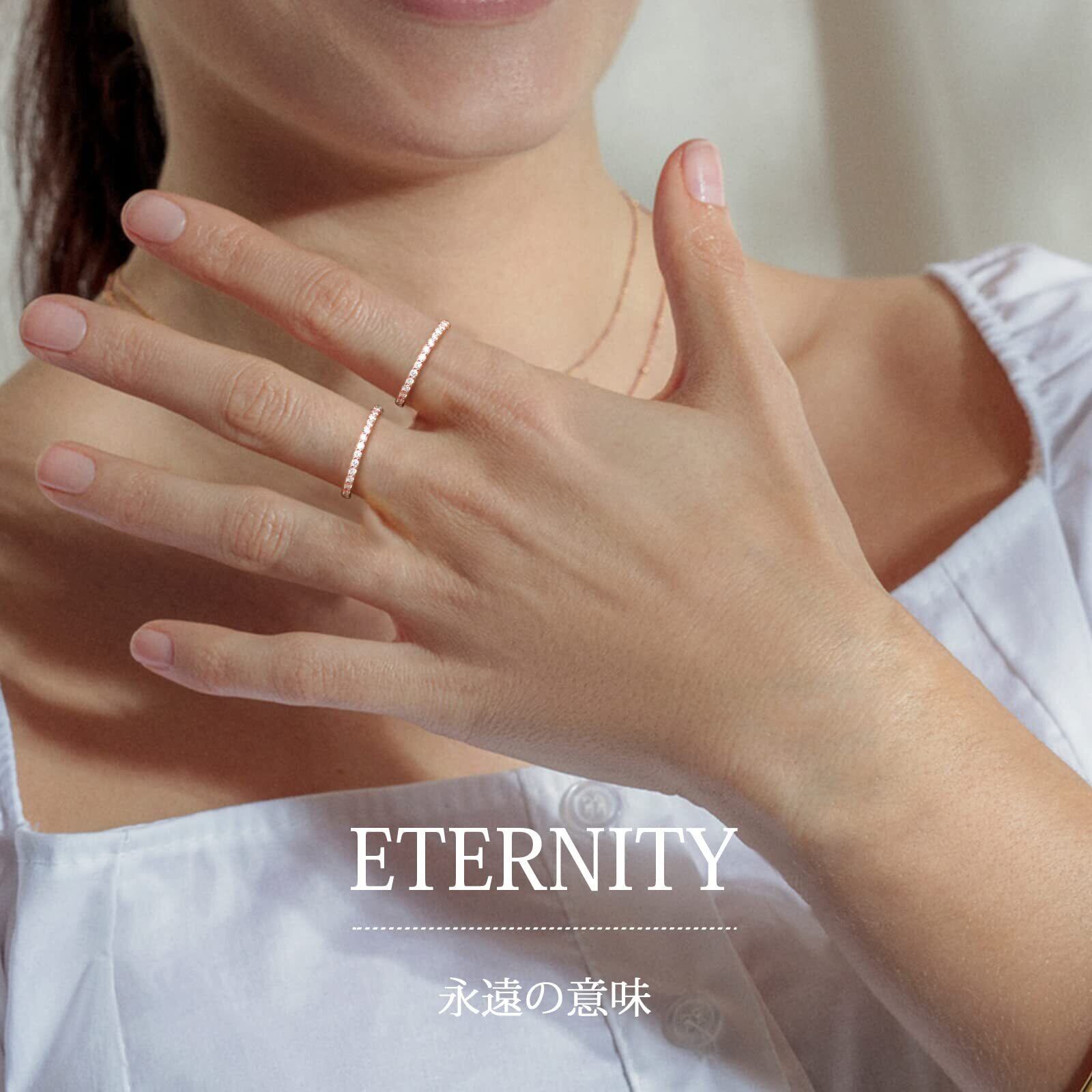 ジュエリーの永遠の定番、エタニティリング。繊細なデザインで、指を美しく見せてくれます。結婚指輪として単体で使うのも良し、重ねて使うエタニティリングとしても良し。