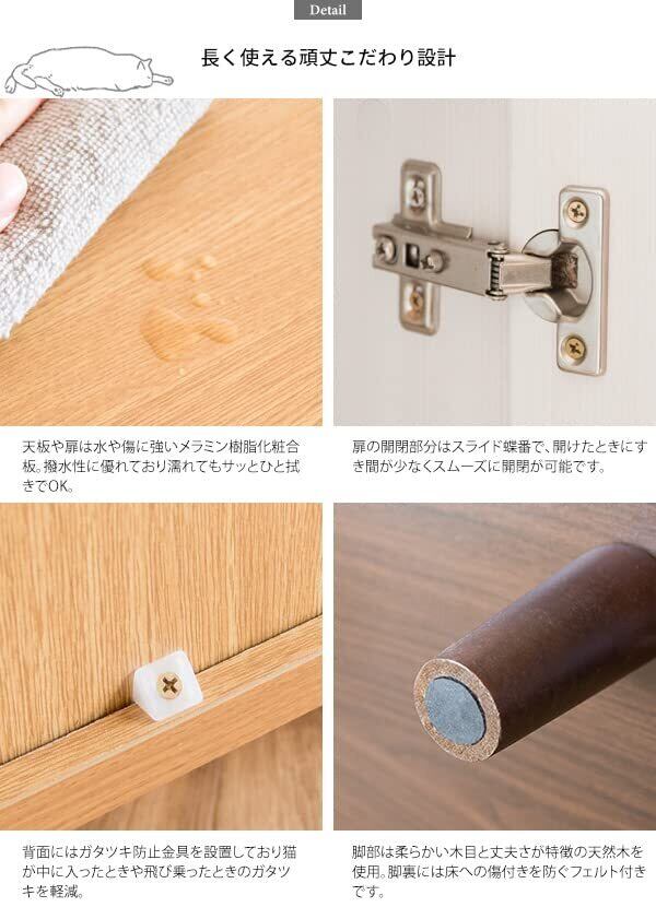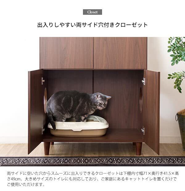 猫用トイレを見映え良く隠してくれるキャットトイレクローゼット『Galetta(ガレッタ)』。上品な木目とシンプルなデザインで清潔感のあるお部屋を演出できます。 猫が出入りできる左右の穴は段差があるので猫砂が外に飛び散りにくく、毎日のお掃除の負担を軽減してくれます。左右に開く扉付きでお掃除もラクラク。 扉付きの上棚に猫砂のストックなどの猫用品をたっぷり収納可能。天板にも雑貨などが置けるので、デッドスペースの有効活用にもなります。