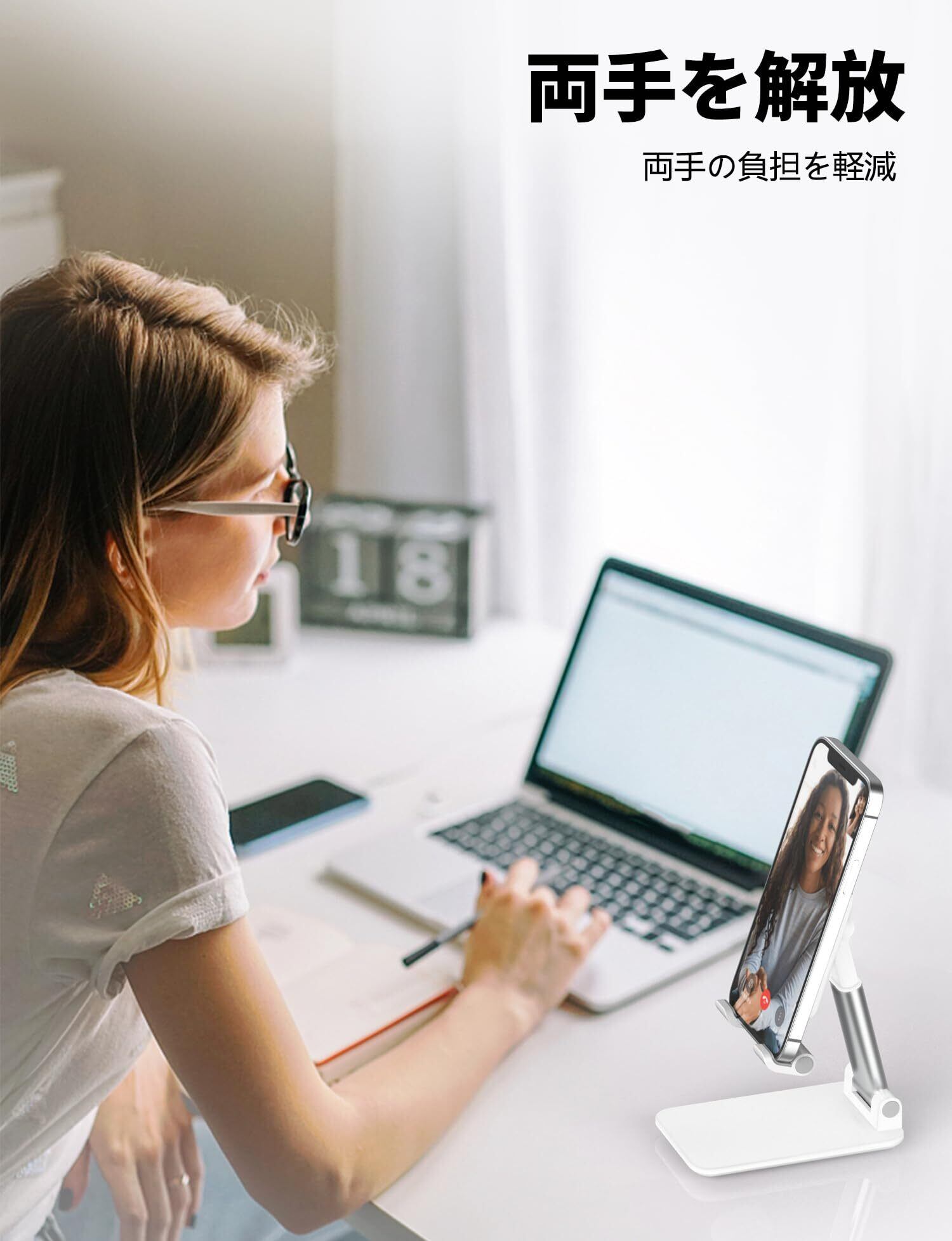 【両手を解放】オフィスデスク、食卓、料理台に適用できます。仕事中でもメールやメッセージ受信を確認できます。充電しながら動画やゲームを楽しめます。人間工学に基づいてデザインされており、ミリ単位で座高に合わせ、最適な角度・高さに調整し、目の疲れ・肩こり・頚髄症・腰痛といった体への負担を減らしましょう。
