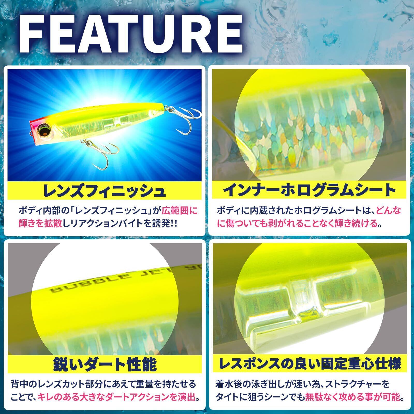 ◆バランスが取れた重心設計により抜群の遠投性能と操作性を両立。◆ポッピングによる図太いサウンドとスプラッシュ、さらに連続したバブルを発生させ深場にいる魚にもしっかりアピール。◆高強度の肉厚ボディで小型~中型青物狙いにも大活躍。