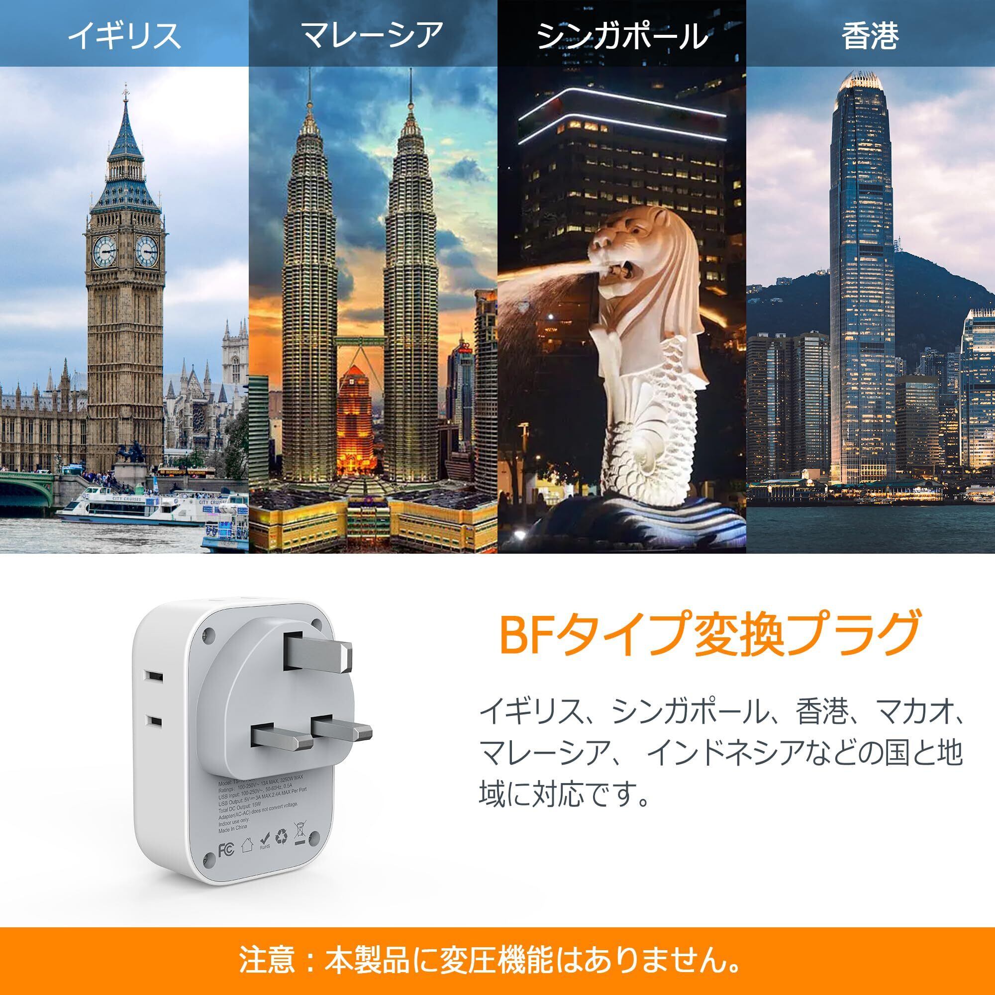TESSAN 変換プラグ 海外旅行用 BFタイプ 変換器 電源変換アダプター コンセント変換 香港/シンガポール/マレーシア/マカオ/イギリスなどの地域に対応