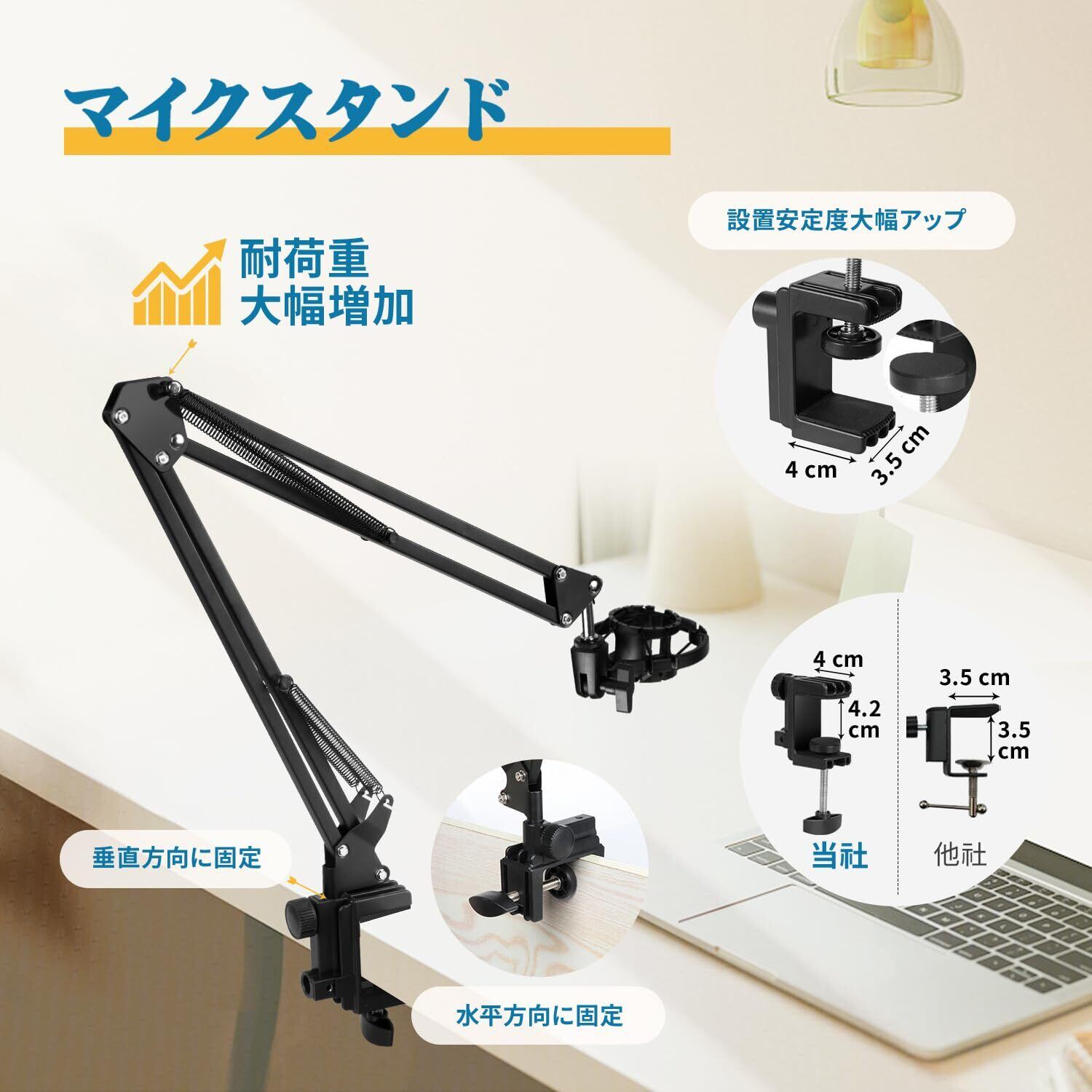 【360°自在にポジショニング】マイクスタンドを水平方向と垂直方向に固定できるため、卓上だけではなく、ベッドにでも固定できます。アームは改良されたデザインを採用し、回転可能な固定クランプと合わせると場所を取らず、360°自由にポジショニングを実現。