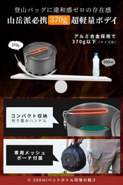 【荷物を軽く、使い勝手はしっかり|370g以下の超軽量&収納性◎】軽量設計で、登山やソロキャンプはもちろん、ツーリングやグループキャンプでも荷物の負担を軽減。折りたたみ式ハンドル&OD缶収納可能なコンパクト設計で、ザックにもすっきり収まります。付属のメッシュ収納袋で持ち運びも快適。
