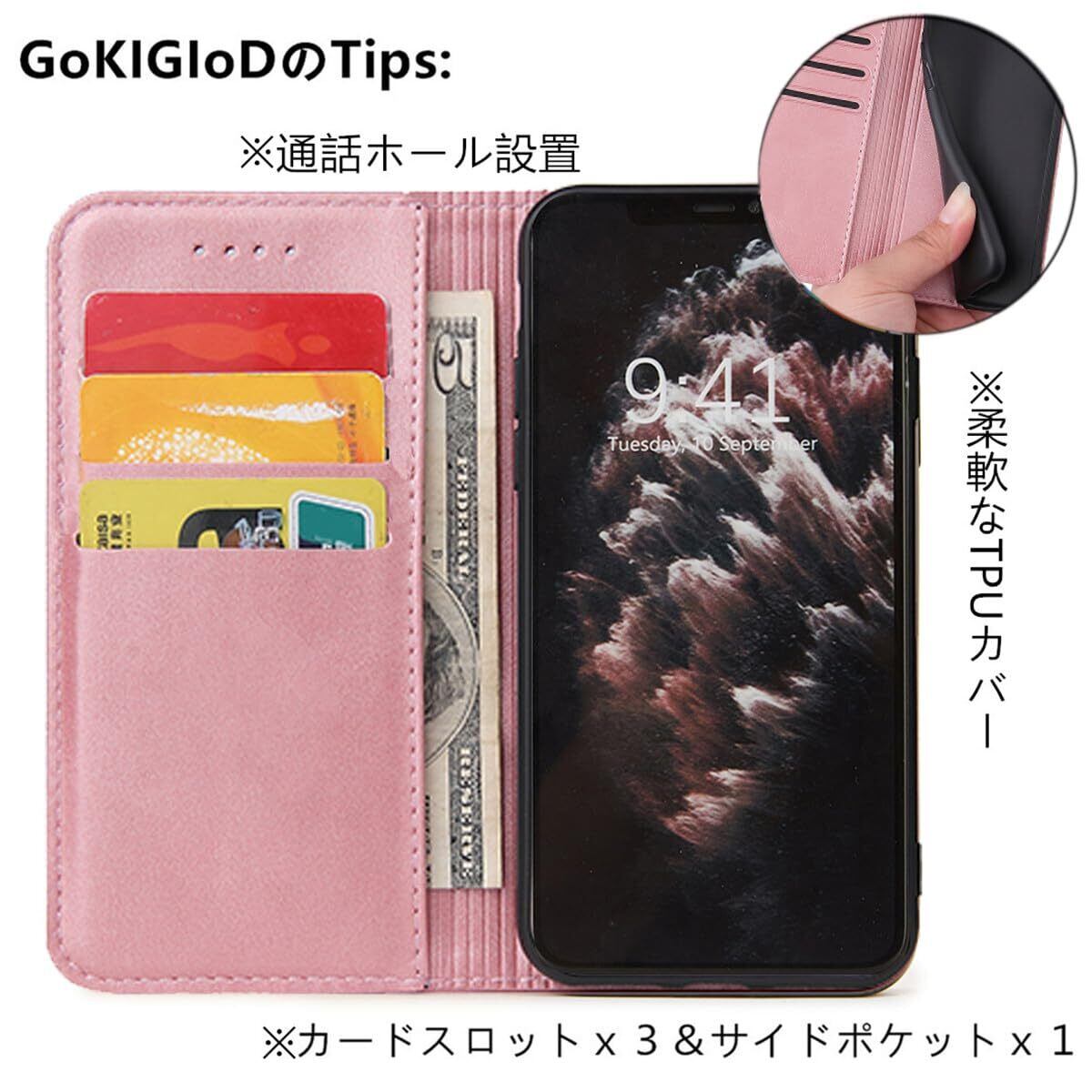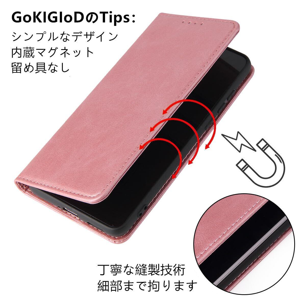 【機能性②】:マグネット内蔵ので、磁気閉鎖機能を持ちます。精密な縫製技術を重ねて出来上がったのは、この手帳型ケースです。二重カバーのデザインにより、大切な携帯をキズ、汚れ、衝撃からしっかりと保護できます。