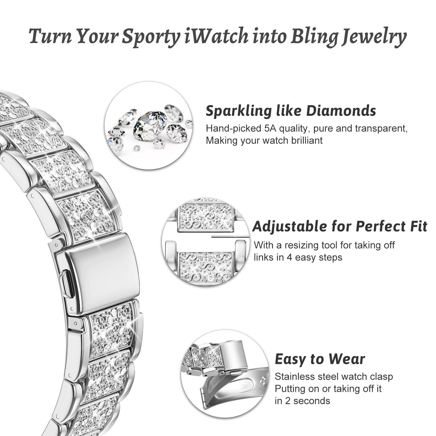 [wutwuk] Apple Watch ブレスレット 45 mm レディース グリッター Apple Watch 9/8/7 に対応 ブレスレット 45 mm レディース ラインストーン保護ケース Apple バンドブレスレット Apple Watch ブレスレット 女性用 エレガント シルバー