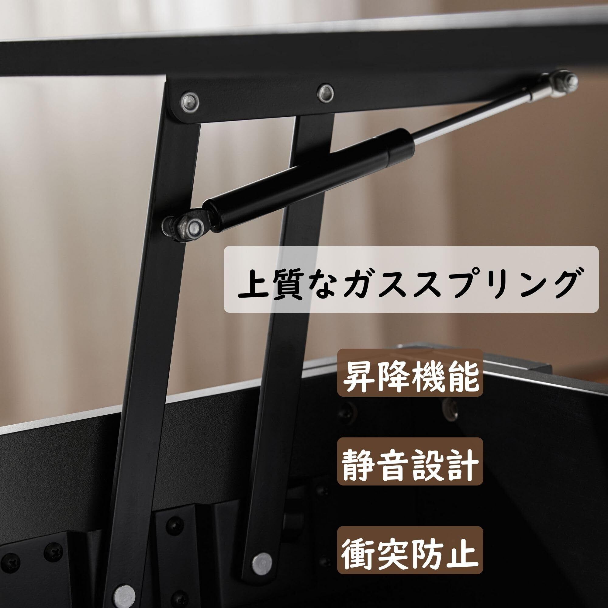 【静かでスムーズな昇降、安心の安全設計】高品質なガススプリングを使用し、昇降が静かでスムーズに行えます。さらに、天板と本体の間には安全設計が施されており、指を挟まないように配慮されています。お子様やペットがいるご家庭でも安心して使用できます。