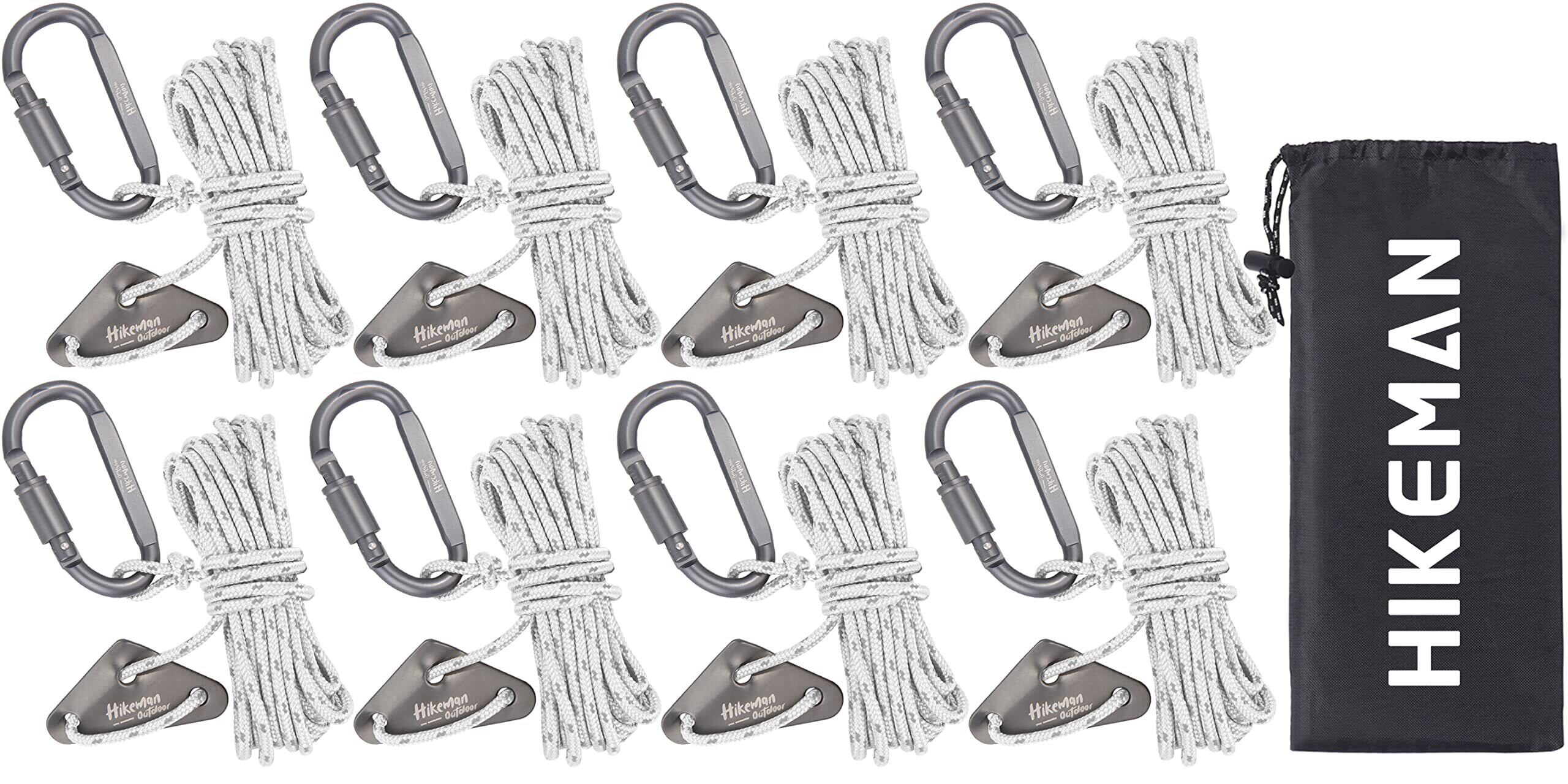 【セット内容】4mm * 4mのロープ ×8本、アルミニウム製自在金具x8個、カラビナx8個、黒い収納袋x1個。ロープの内側がナイロン、外側がポリエステル。自在金具はアルミニウム。重さ:0.3kg、耐荷重:350kg