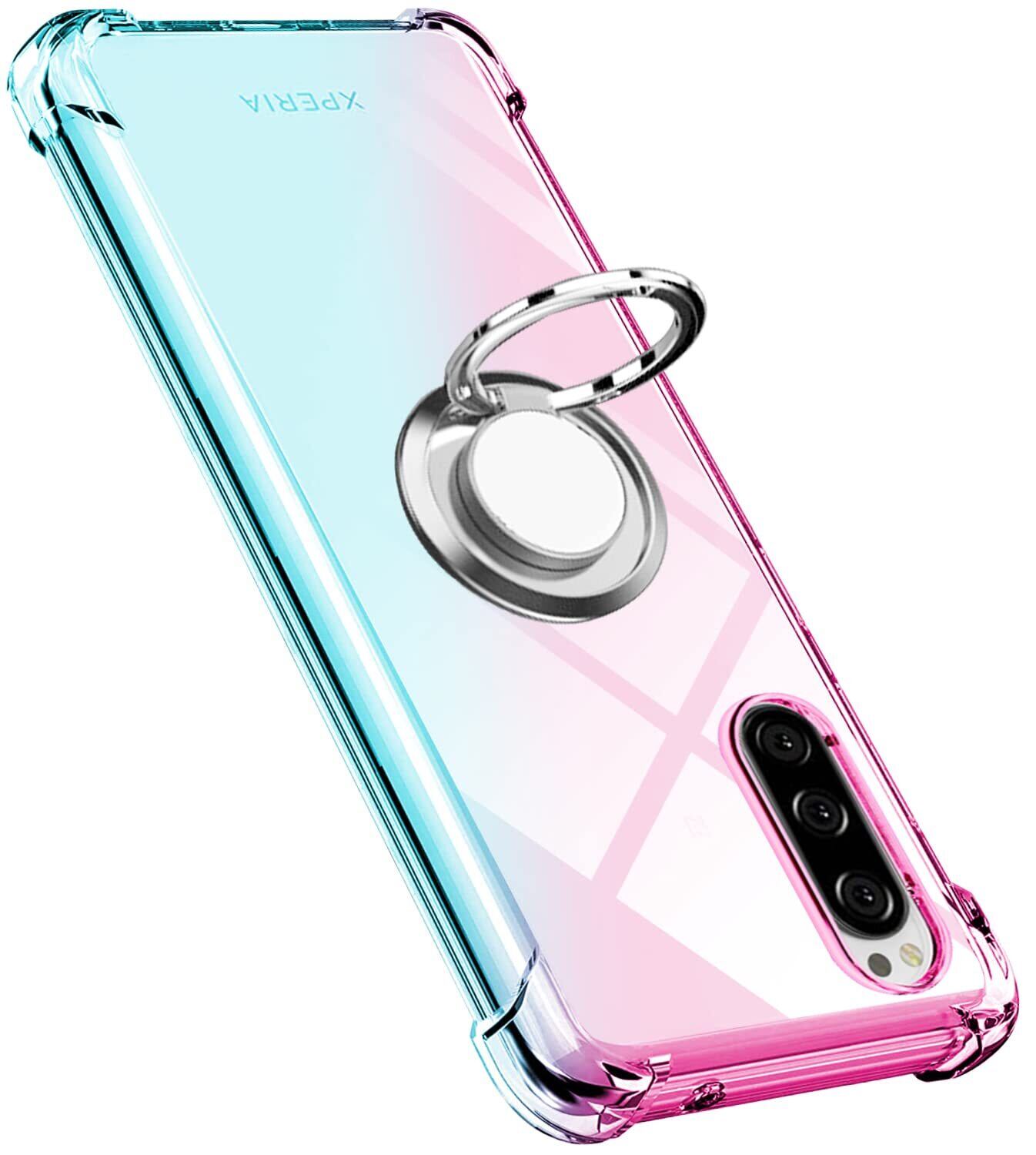 Xperia 5 ケース リング クリア TPU シリコン リング付き薄型 グラデーション色軽量シリコン 耐衝撃 SO-01M SOV41 901SO 指紋防止 360回転 車載ホルダー対応 一体型 人気 携帯カバーエクスペリア 5 ケース(ピンクグリーン)