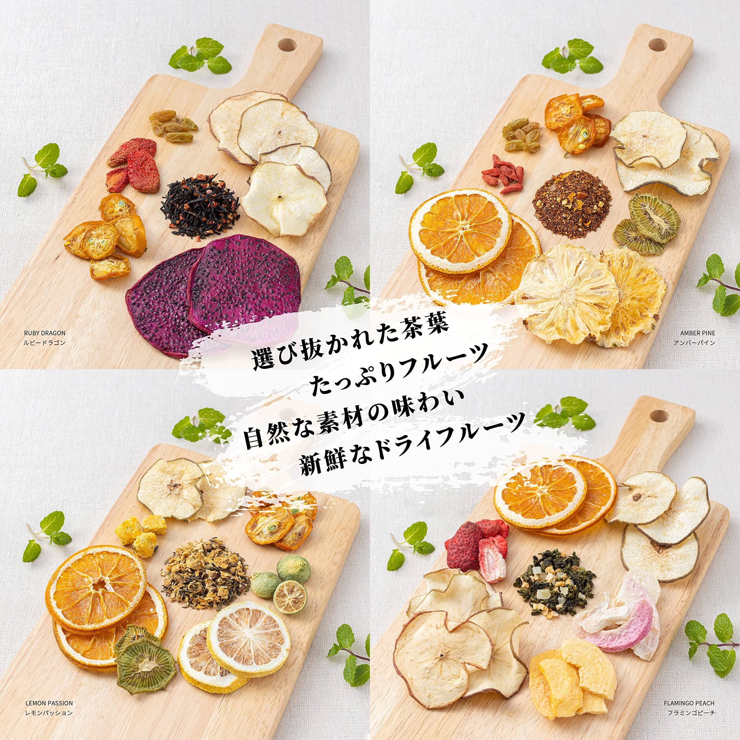 新鮮なフルーツのフリーズドライ・低温乾燥のドライフルーツと、相性の良い茶葉を組み合わせた「Dozo Freesh Fruits Tea」全4種。水より美味しい、コーヒーよりカフェインレス、カロリー0(ゼロ)でジュースより健康な「第3の飲み物」として、カフェインレスでヘルシーなフルーツティー。