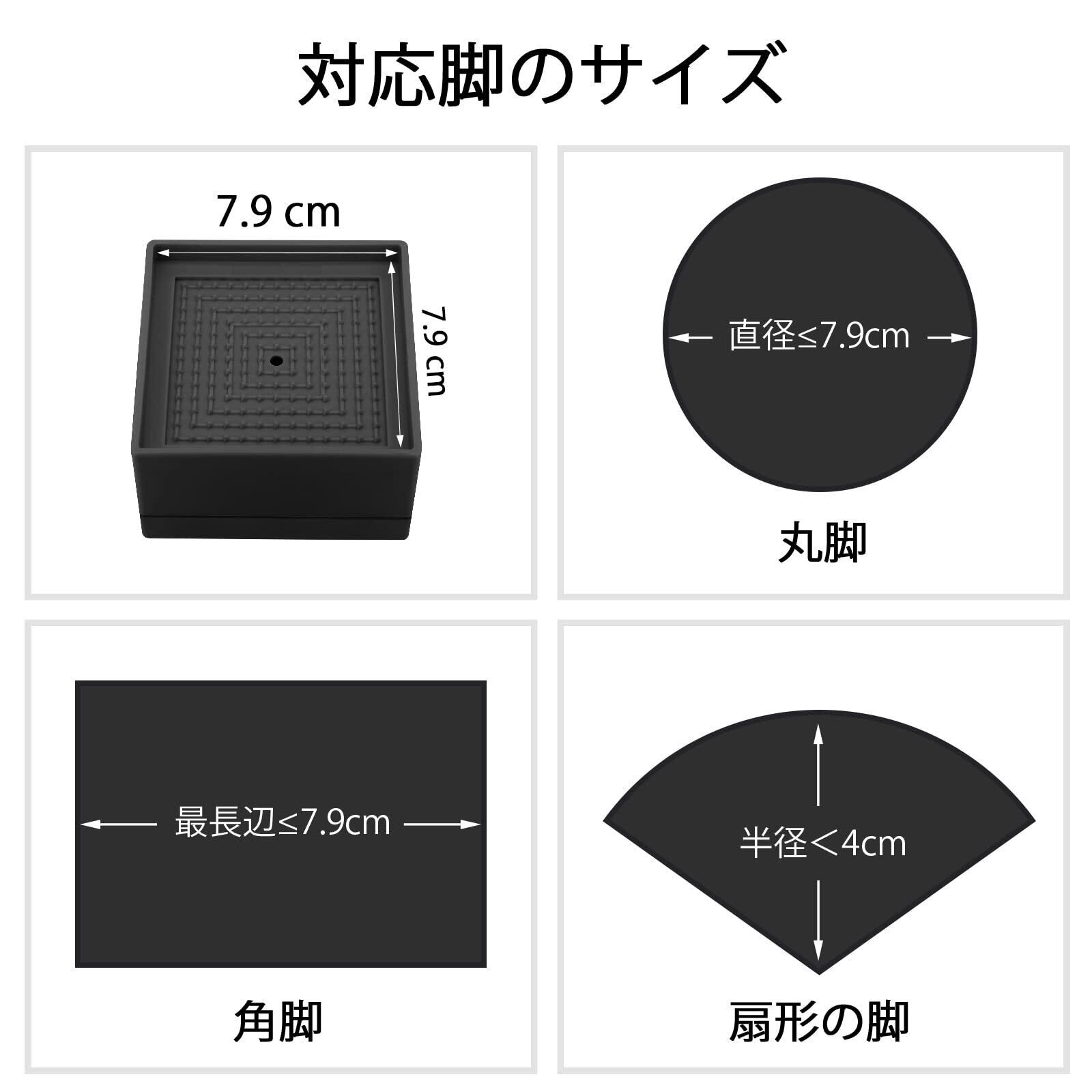 【様々な家電・家具に適用】500kgの重さにも耐えられ、安定性が高いです。脚を置く天面のサイズ(7.9×7.9cm)がほとんどの家電製品と家具の脚に合っています。色は目も立ちません。※適用対象:丸足の直径が7.9センチ内(矩形足の最長辺が7.9センチ内)の縦型・ドラム式洗濯機、冷蔵庫、食洗機、エアコン、テーブル、机、ソファー、ベッド、こたつテーブルなどの家電製品と家具