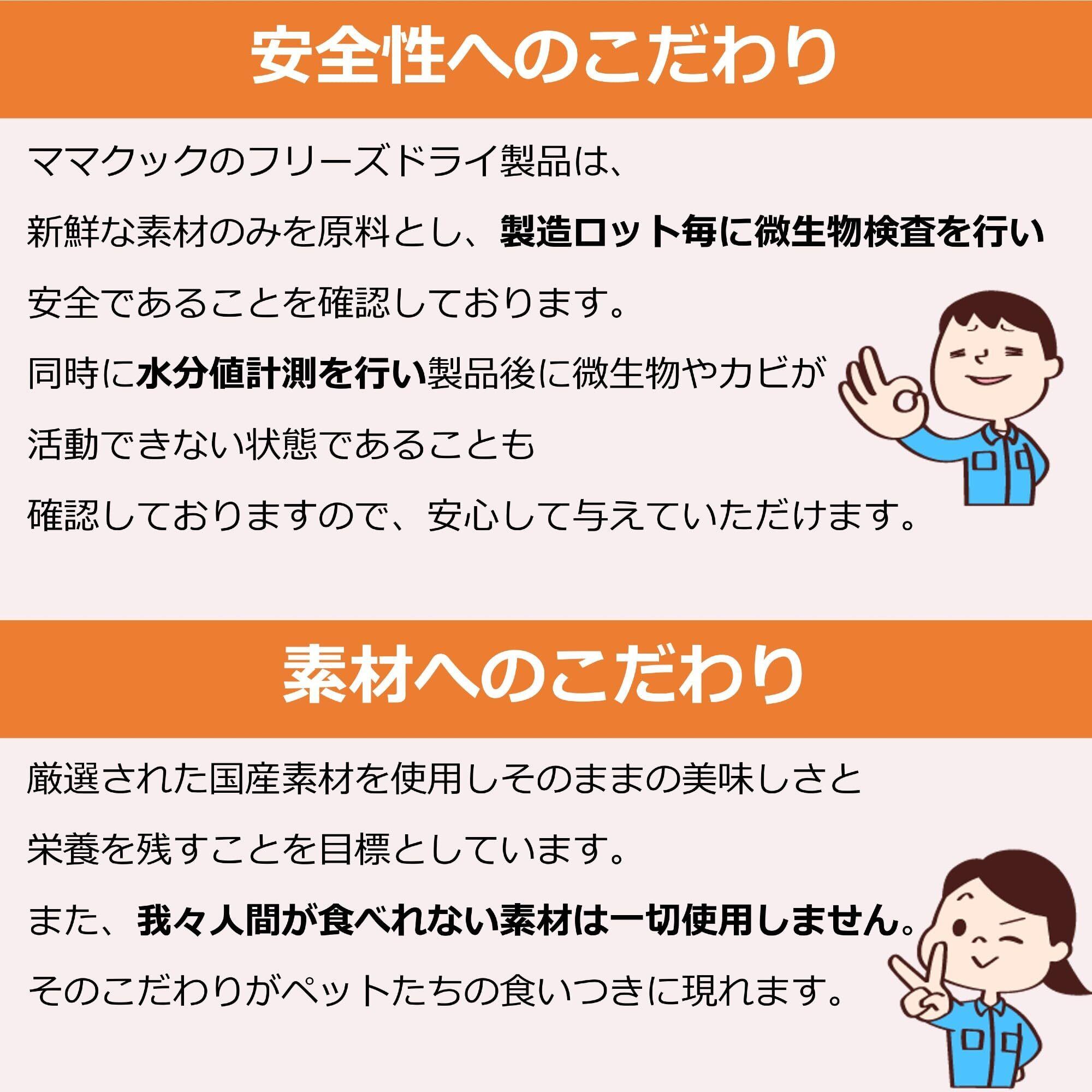 ママクックのフリーズドライ製品は、新鮮な素材のみを原料としフリーズドライ乾燥前と乾燥後に菌検査を行い、安全であることを確認しております。同時に水分値計測を行い製品後に菌が増殖できない状態であることも確認しておりますので安心して与えていただけます。