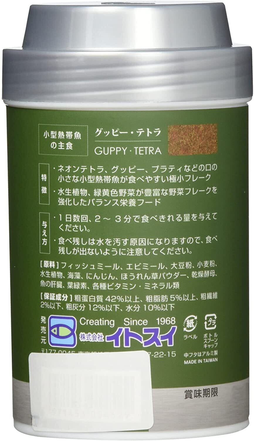 口の小さな小型熱帯魚が食べやすい極小フレーク。野菜フレークを強化したバランス栄養フード。スプーン付のボトルタイプで簡単に給餌可能です!!
