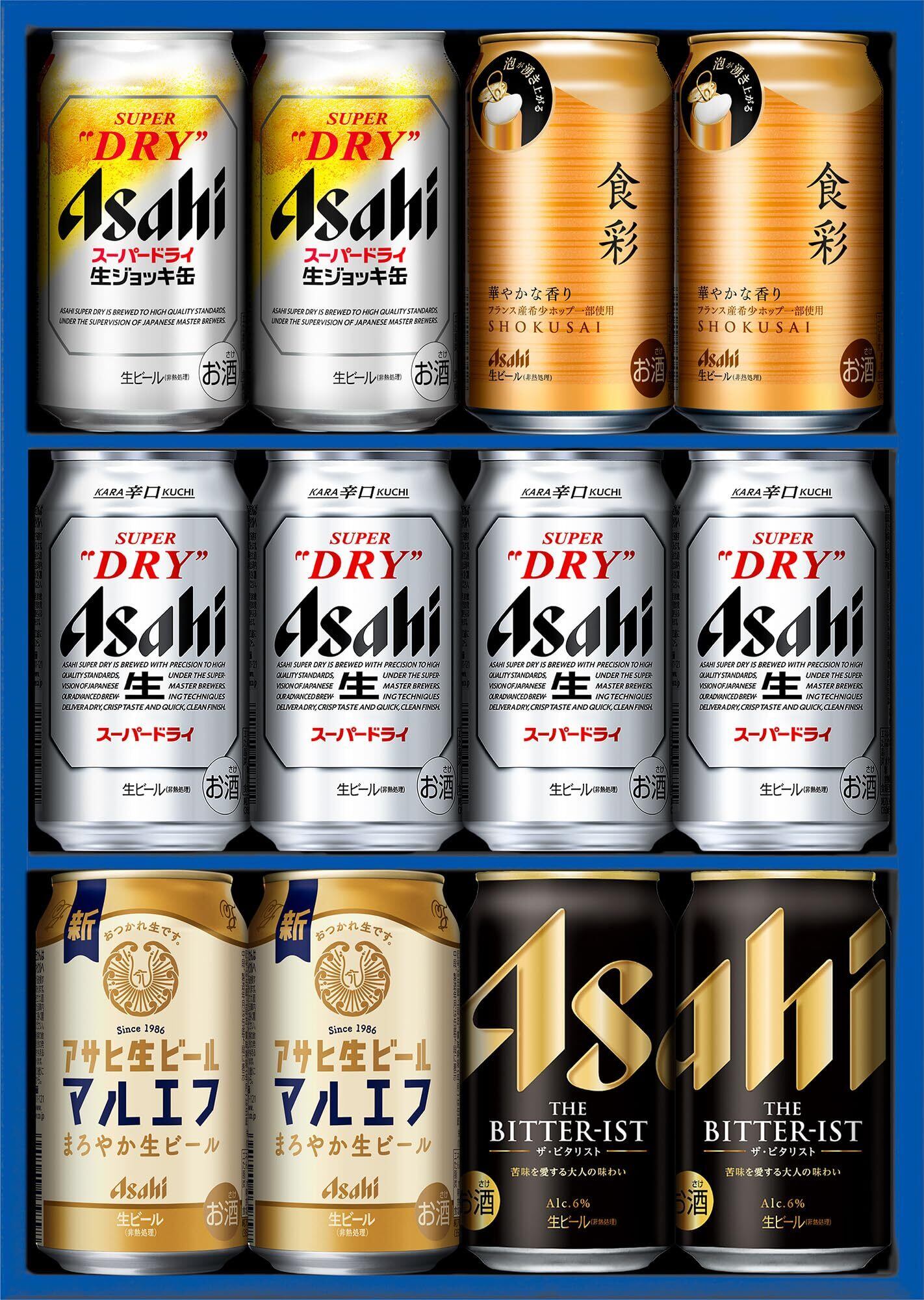 セット内容:アサヒスーパードライ350ml×4本、アサヒスーパードライ生ジョッキ缶340ml×2本、アサヒ生ビール350ml×2本、アサヒ食彩340ml×2本、アサヒ ザ・ビタリスト350ml×2本