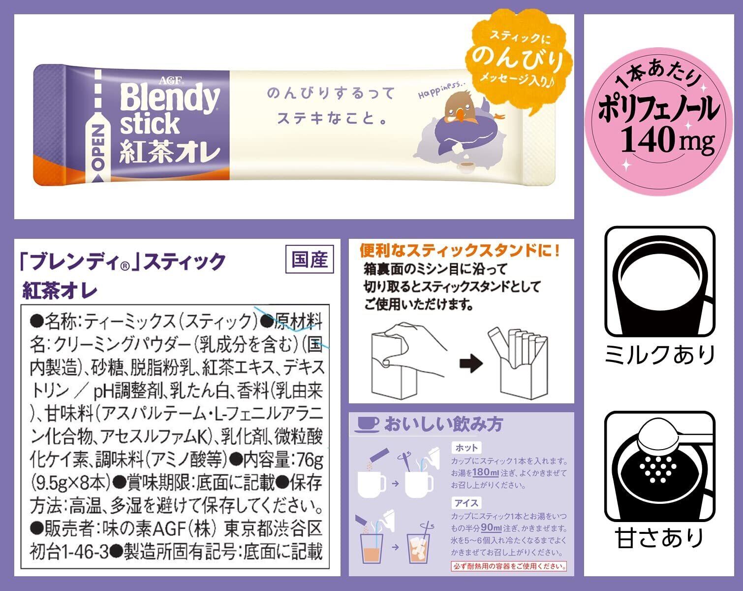 【ブレンディスティック 紅茶オレ】クリーミングパウダー(乳成分を含む)(国内製造)、砂糖、脱脂粉乳、紅茶エキス、デキストリン / pH調整剤、乳たん白、香料(乳由来)、甘味料(アスパルテーム・L-フェニルアラニン化合物、アセスルファムK)、乳化剤、微粒酸化ケイ素、調味料(アミノ酸等)
