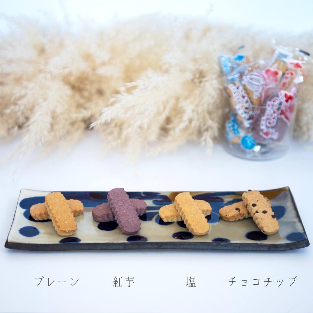沖縄の定番、「ちんすこう」の人気フレーバー4種、紅芋・チョコチップ・塩・プレーンをセットにしました。