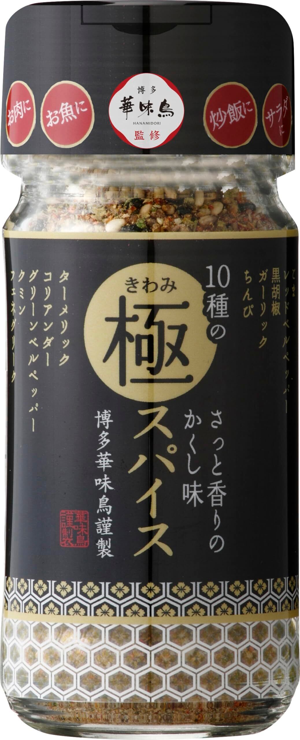 博多華味鳥が厳選したスパイス(1. ガーリック、2.レッドベルペッパー、3.黒胡椒、4.ごま、5.グリーンベルペッパー、6.ちんぴ、7.ターメリック、8.コリアンダー、9.フェネグリーク、10.クミン)などを調合し、ローストチキン、チキンソテー、焼き鳥など鶏肉料理合うスパイスを作りました。鶏肉料理の他は牛肉、豚肉、魚、炒飯やポテトサラダ、白ごはんにふりかけ代わりに気軽に使える本格的な味わいのスパイスです。ご家庭の料理の「さっと香りのかくし味」です。