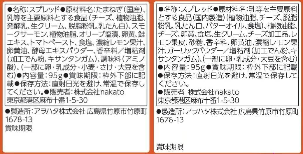 【北海道産スモークサーモンとオリーブのパテ】たまねぎ(国産)、乳等を主要原料とする食品(チーズ、植物油脂、発酵乳、生クリーム、脱脂粉乳、乳たん白)、スモークサーモン、植物油脂、オリーブ塩漬、卵黄、鮭エキス、トマトペースト、食塩、濃縮レモン果汁、卵黄油、酵母エキスパウダー、香辛料/増粘剤(加工でん粉、キサンタンガム)、調味料(アミノ酸)、(一部に卵・乳成分・小麦・さけ・大豆を含む)【2種のチーズのパテ パルミジャーノ・レッジャーノ使用】乳等を主要原料とする食品(国内製造)(植物油脂、チーズ、脱脂粉乳、乳たん白、バターオイル、食塩)、植物油脂、チーズ、卵黄、食塩、生クリーム、チーズ加工品、レモン果皮、砂糖、香辛料、卵黄油、濃縮レモン果汁、ガーリックパウダー/増粘剤(加工でん粉、キサンタンガム)、(一部に卵・乳成分・大豆を含む)