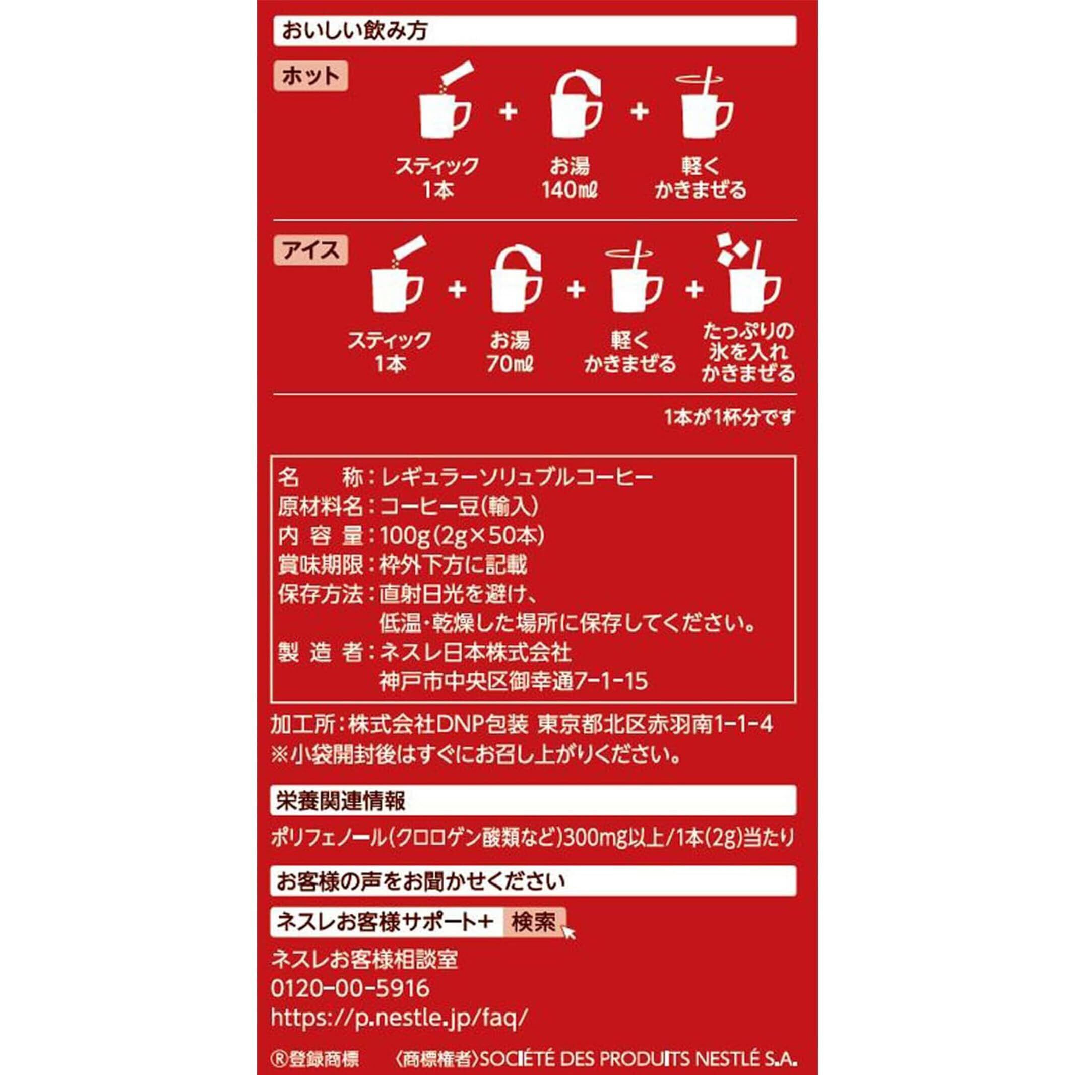 飲み方:【ホットコーヒー】 約2g(スプーン1~2杯)+お湯140ml【カフェラテ】約2g(スプーン1~2杯)+「ネスレブライト」3gまたは牛乳30ml+お湯140ml【アイスコーヒー】約2g(スプーン1~2杯)+お湯70ml+氷2~3コ(70ml分)