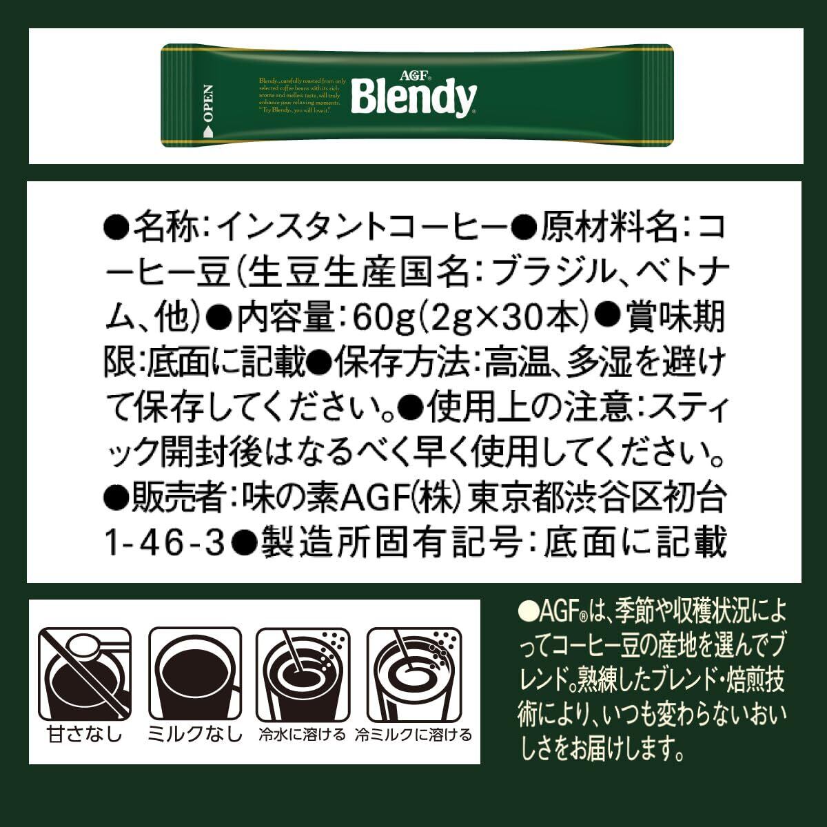 「カフェオレは、得意なんです。ブレンディ。」でおなじみの「Blendy(ブレンディ)」 インスタント・コーヒーは、独自の焙煎技術により、まろやかで豊かなコクと香りが楽しめます。スプレードライ製法にひと手間加えた独自のアグロマート製法の粉末なので、冷たい水や牛乳(ミルク)にも簡単に溶け、ホットはもちろん、アイスコーヒーやアイスカフェオレにも最適です。AGF(エージーエフ) 「ブレンディ」 パーソナルインスタントコーヒー30本は、まろやかで豊かなコクと香り。冷たい水や牛乳にもおいしく溶ける、ブレンディ パーソナルタイプのスティックコーヒーです。1杯1杯がいつも新鮮な個包装スティックコーヒー(ブラック、ミルクなし、甘さなし)です。冷たい水や牛乳にもサッと溶けるので、簡単にアイスコーヒーやアイスカフェオレが楽しめるインスタントコーヒーです。お試ししやすいトライアルサイズ。ブラックコーヒーではもちろんお好みでスティックシュガーやスティックコーヒーミルクと一緒にオフィスやご家庭でお楽しみください。コーヒー豆の焙煎から充填まで国内の工場で生産し、繊細な日本人の味覚に合わせて開発したインスタントスティックコーヒーです。 原材料・成分 原材料:コーヒー豆(生豆生産国名:ベトナム又はブラジル又はその他)