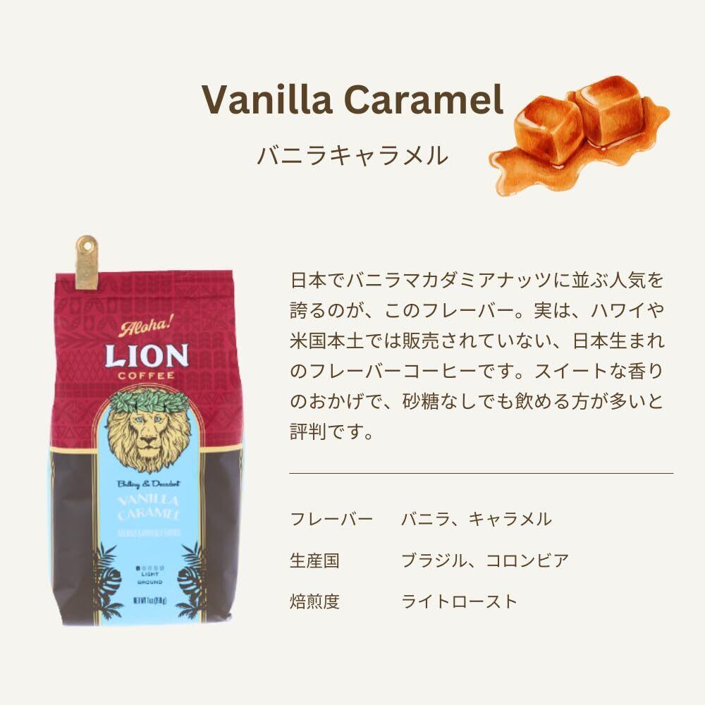 ライオンコーヒー バニラキャラメル 粉 7oz (198g) フレーバーコーヒー ドリップ ハワイ 中挽き 浅煎り ライトロースト 水出しOK 新パッケージ 人気 ギフト lion coffee