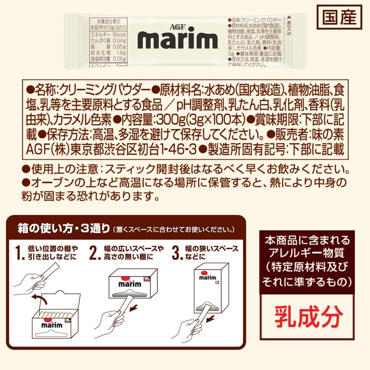 AGF(エージーエフ) 「マリーム」 スティック100本は、コーヒーを引き立て、まろやかな味わいに仕上げるクリーミングパウダー。お客様のおもてなしや、オフィス用、アウトドアにも最適な1杯1杯がいつも新鮮な個包装スティックタイプ。