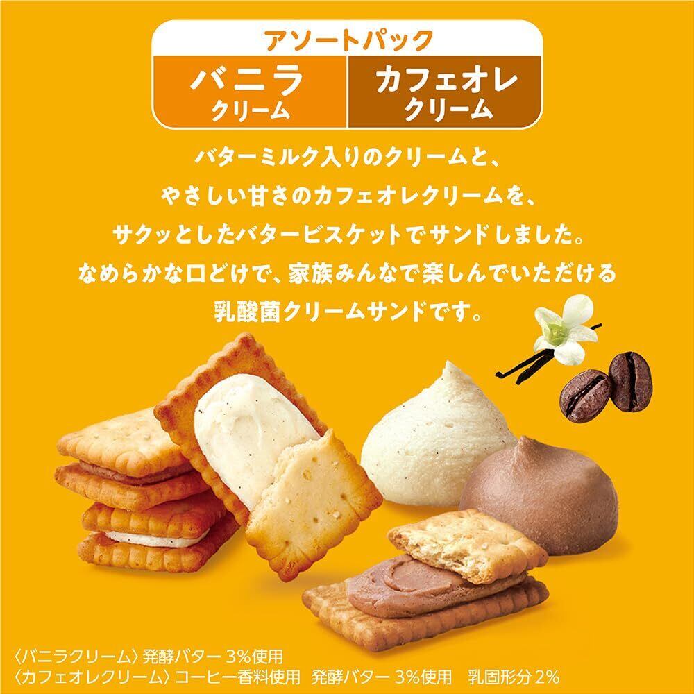 バターミルク入りのバニラクリームと、やさしい甘さのカフェオレクリームの2種類の味が入っています。 なめらかな口どけで、家族みんなで楽しんでいただけます。 カルシウム、ビタミンD、ビタミンB1、ビタミンB2もたっぷり入っています。