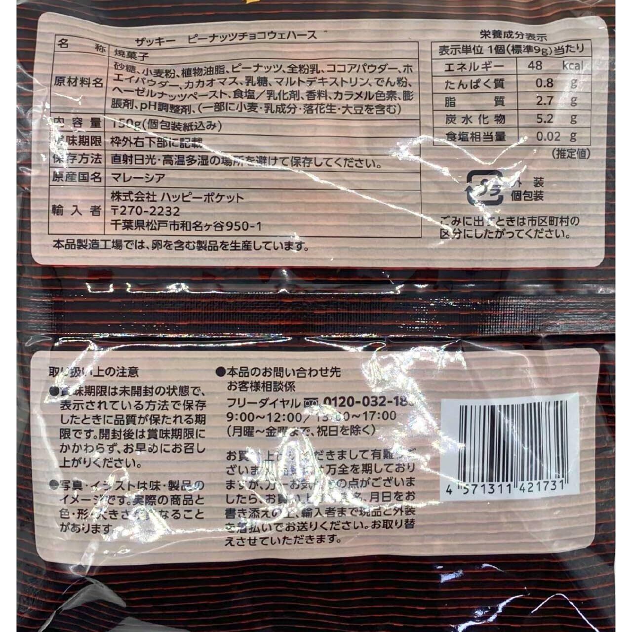 ハッピーポケット ザッキー Zackey ピーナッツチョコウエハース 150g ×3袋セットです。 香ばしいピーナッツチョコと歯ごたえのあるウェハースを重ねた食べ応えのあるウエハースです。 一枚一枚個包装されているので好きなときに好きなだけ食べることができ、おやつにもピッタリです。