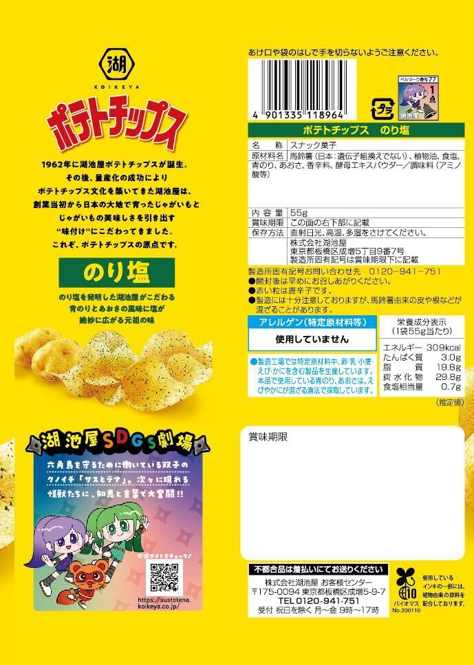 馬鈴薯(日本:遺伝子組換えでない)、植物油、食塩、青のり、あおさ、香辛 料、酵母エキスパウダー/調味料(アミノ酸等)