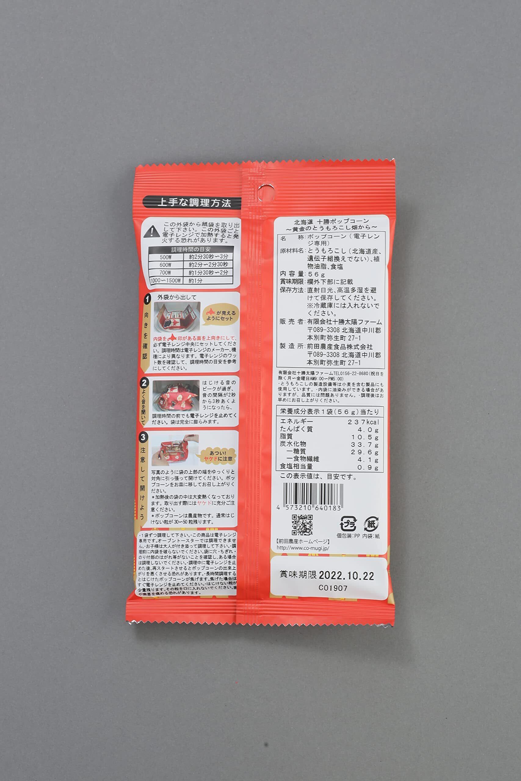 *原材料名:とうもろこし(北海道産、遺伝子組換えでない)、植物油脂、食塩 *保存方法:直射日光、高温多湿を避けて保存してください。冷蔵庫では保管しないでください。 *とうもろこしの製造施設等は小麦を含む製品にも使用しています