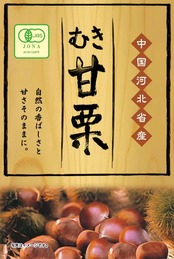 JAS認定有機天津むき甘栗使用、天津甘栗の独特の風味、香ばしさ、自然の甘さは特徴です。JAS認定有機甘栗圃場の日常管理はJAS認定有機甘栗加工工場の圃場管理課が行います、工場と圃場の長年の協力し合いにより、安心、安全、安定的な甘栗原料の育成と確保は出来ました、混ぜ栗(他省市県村からの栗)の混入防止にも繋がりました。