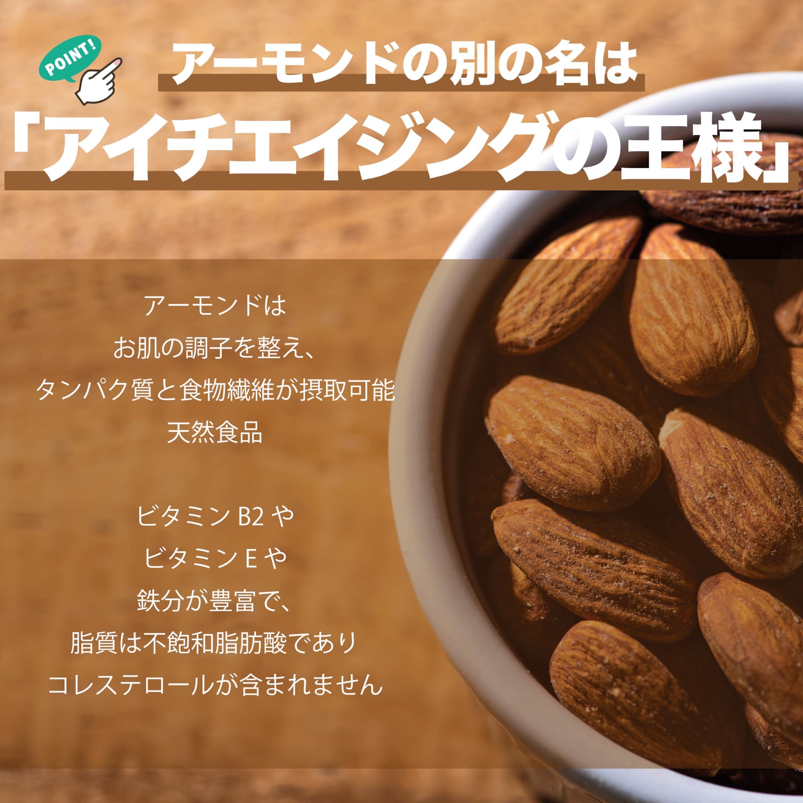 【アーモンドが人気な理由】アンチエイジングの王様と言われお肌の調子を整え、タンパク質と食物繊維が摂取が同時に可能、天然食品ビタミンEや鉄分が豊富でコレステロールが含まれない。