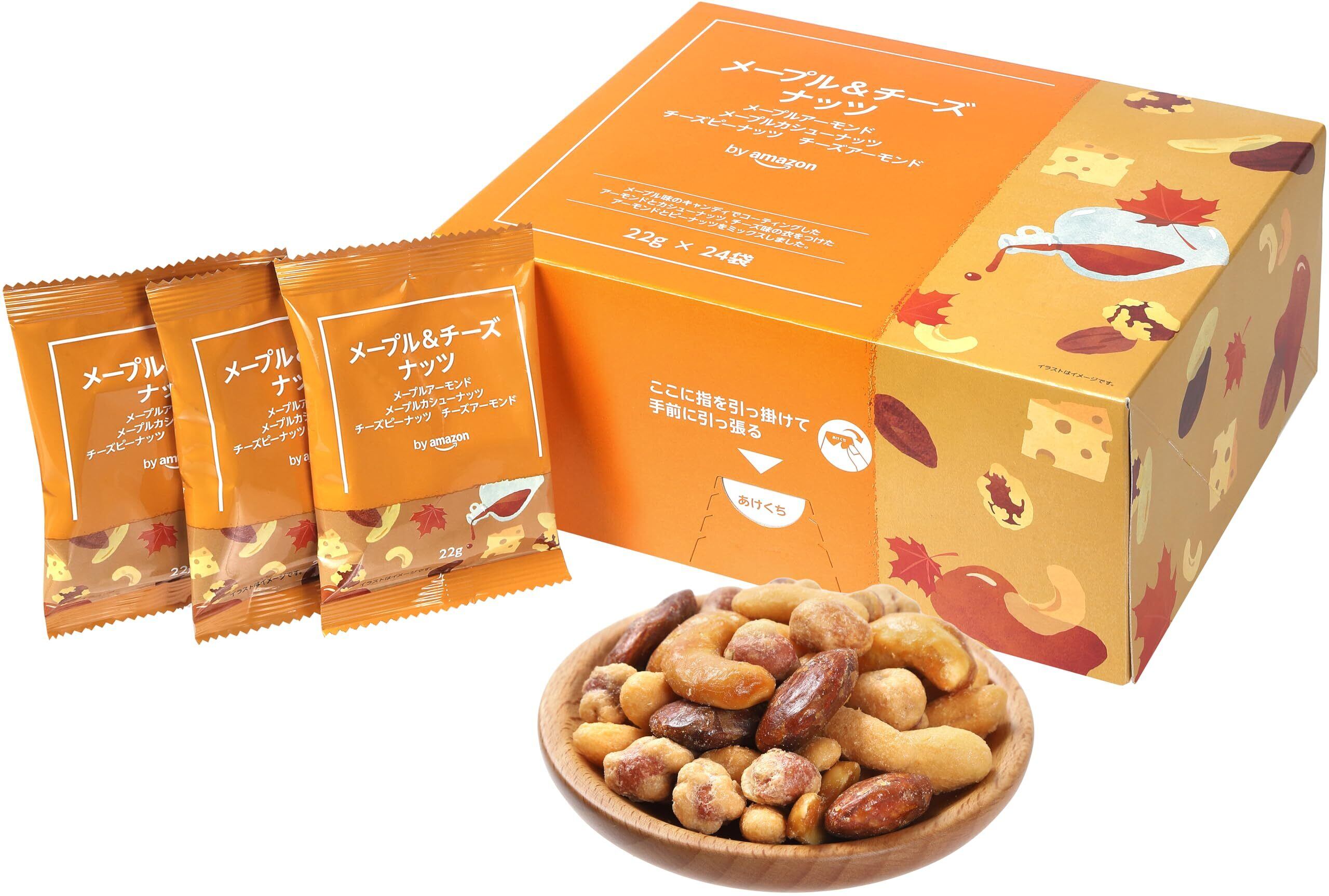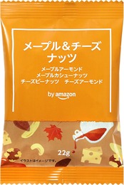 原材料:チーズピーナッツ(落花生(中国)、小麦粉、砂糖、寒梅粉ミックス、澱粉、チーズパウダー、植物油、食塩、チーズ加工品)、メープルアーモンド(アーモンド、砂糖、メープルシロップ、水あめ、黒蜜、植物油、メープルシュガー、食塩)、メープルカシューナッツ(カシューナッツ、砂糖、メープルシロップ、水あめ、黒蜜、植物油、メープルシュガー、食塩)、チーズアーモンド(アーモンド、寒梅粉ミックス、砂糖、小麦粉、チーズパウダー、澱粉、植物油、食塩、チーズ加工品)/トレハロース、増粘剤(加工澱粉)、香料、膨脹剤、乳化剤、調味料(アミノ酸等)、着色料(カロチノイド)、(一部に小麦・乳成分・落花生・アーモンド・カシューナッツ・大豆を含む) 栄養成分表示(個包装1袋(22g)あたり):エネルギー:122kcal/たんぱく質:3.8g/脂質:7.8g/炭水化物:9.2g/食塩相当量:0.2g(この表示値は、目安です)