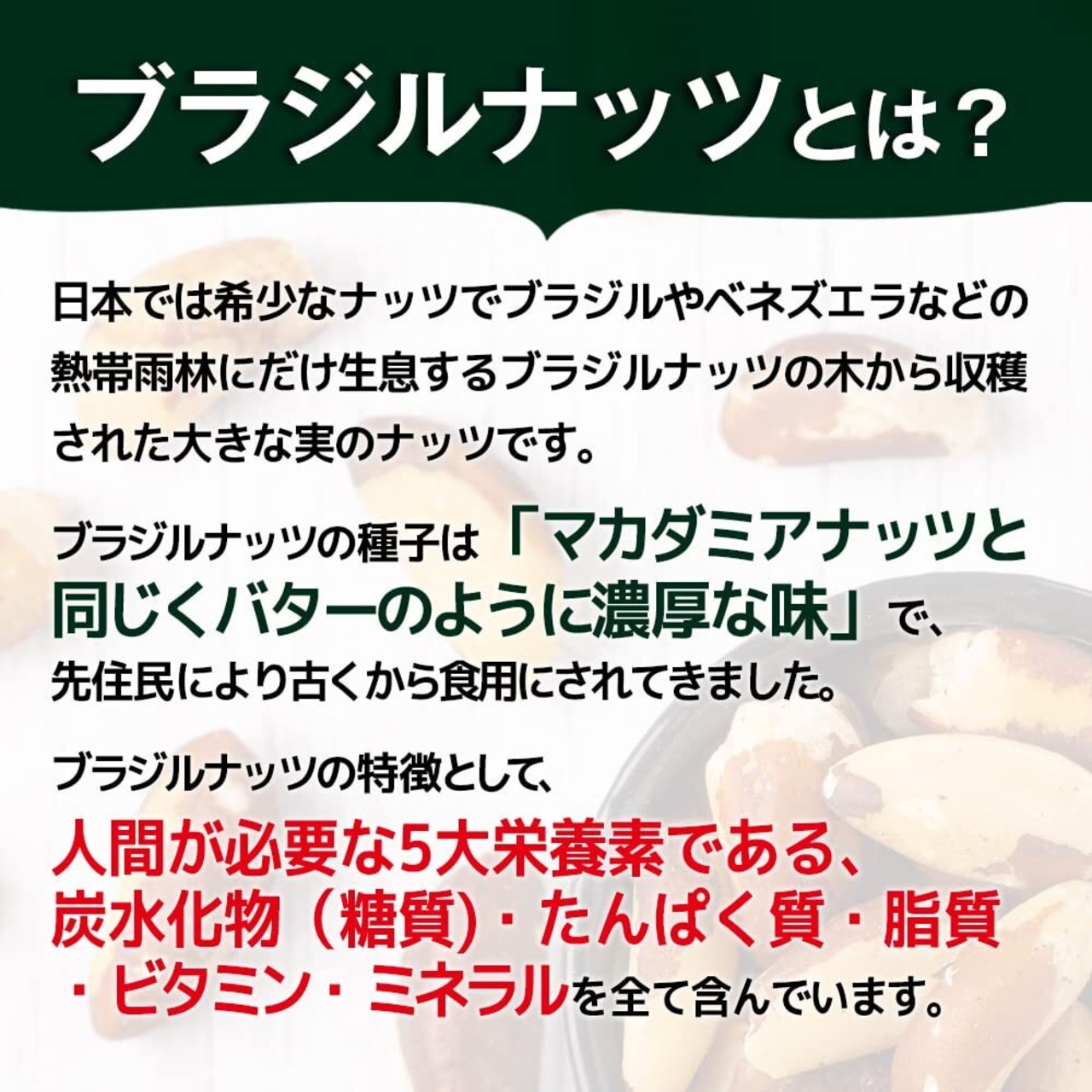 ブラジルナッツの特性ブラジルナッツ本来の独特な風味があります (”土”のような 特徴のある風味が強いナッツです)ブラジルナッツ本来の風味ですので品質には問題ございません。あらかじめご了承ください。