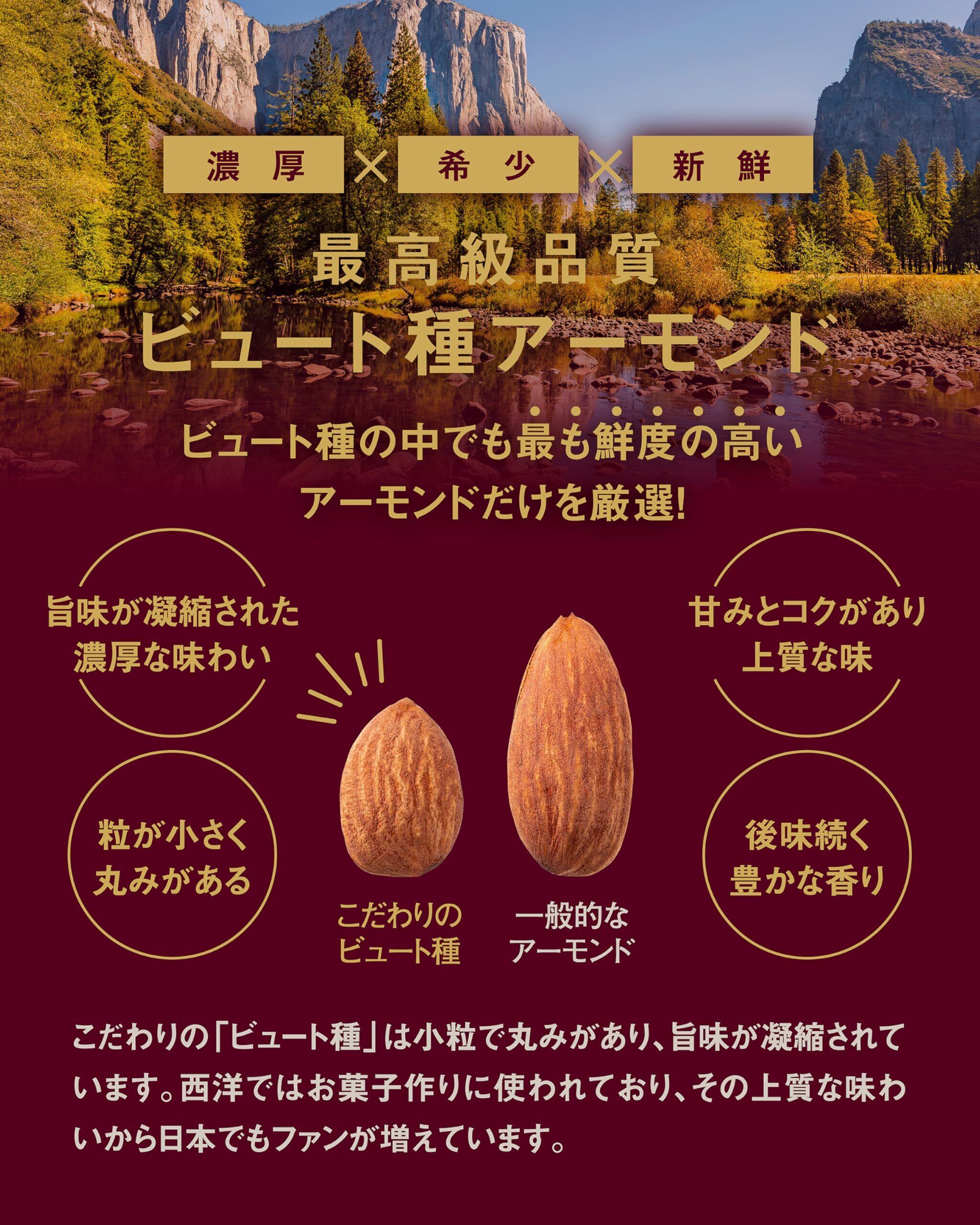 最高級品種「ビュート種」アーモンド一般的に流通している「ノンパレル種」に対し、肉厚で小粒ながら濃厚な味わいと芳醇な香りが特徴の「ビュート種」アーモンド。ただ、生産量が非常に少ない為、日本ではあまり見かけない品種です。そんな希少な「ビュート種」アーモンドの中でも、最も鮮度の高いものだけを厳選し、こだわりの極低温直火焙煎にて、絶妙な風味と舌触りを実現しました。今までのアーモンドの概念が変わる逸品をご賞味ください!