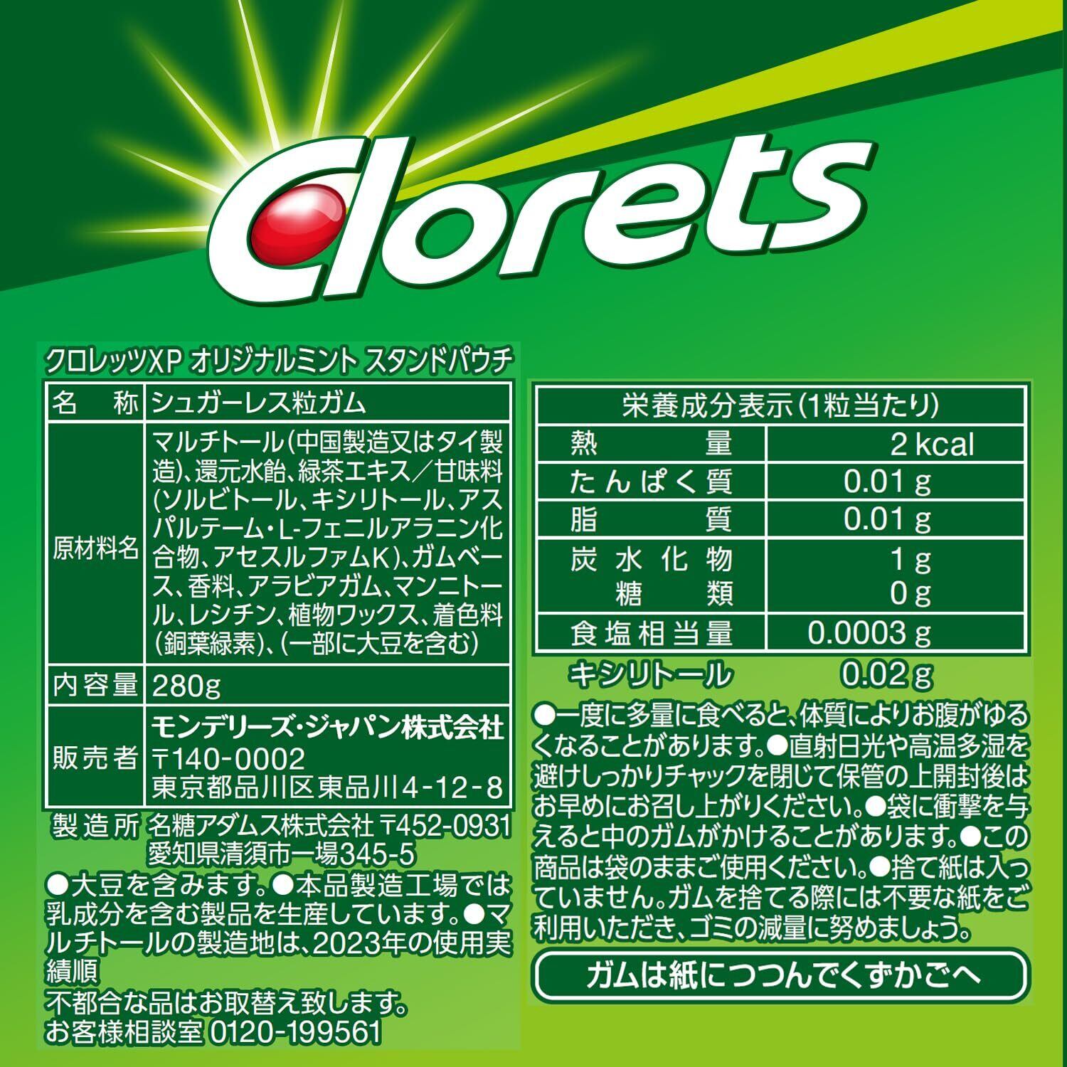 原材料:マルチトール(タイ製造又は中国製造)、還元水飴、緑茶エキス/甘味料(ソルビトール、キシリトール、アスパルテーム L-フェニルアラニン化合物、アセスルファムK)、ガムベース、香料、アラビアガム、マンニトール、レシチン、植物ワックス、着色料(銅葉緑素)、(一部に大豆を含む)
