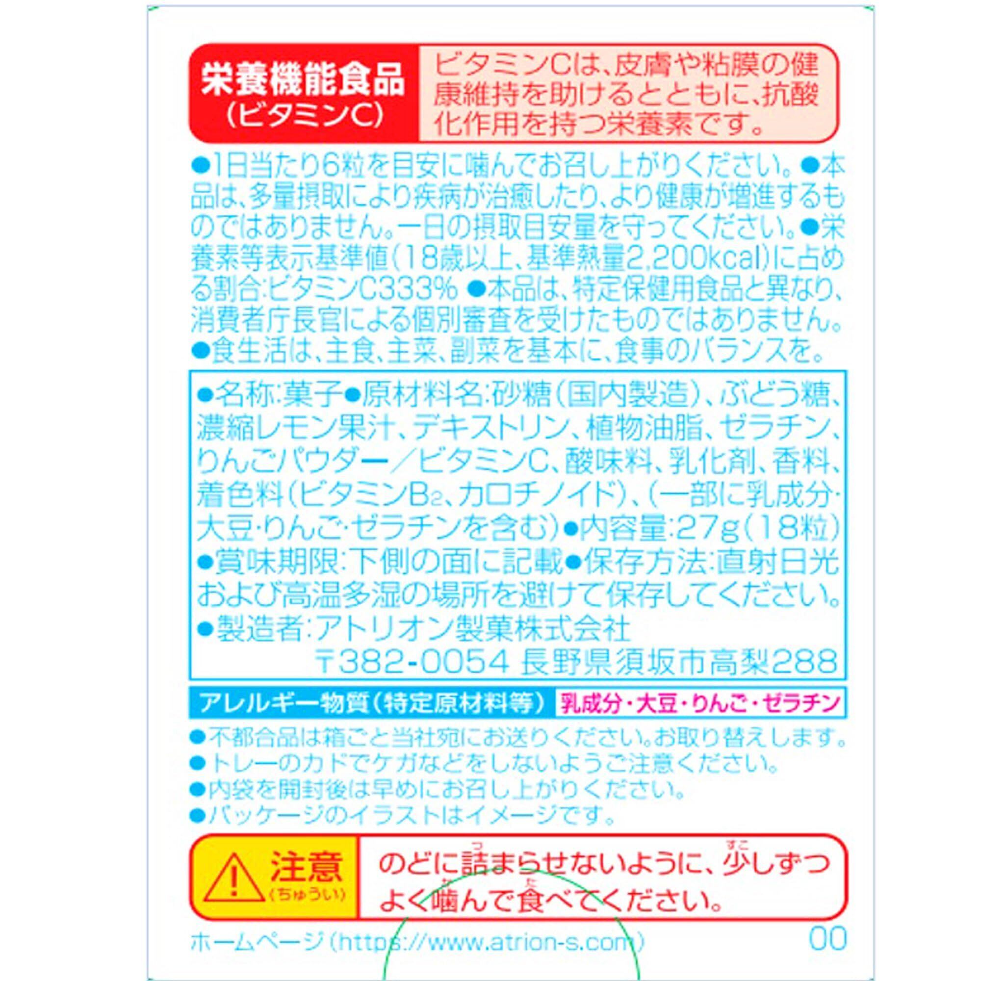 砂糖(国内製造)、ぶどう糖、濃縮レモン果汁、デキストリン、植物油脂、ゼラチン、りんごパウダー/ビタミンC、酸味料、乳化剤、香料、着色料(ビタミンB2、カロチノイド)、(一部に乳成分・大豆・りんご・ゼラチンを含む)