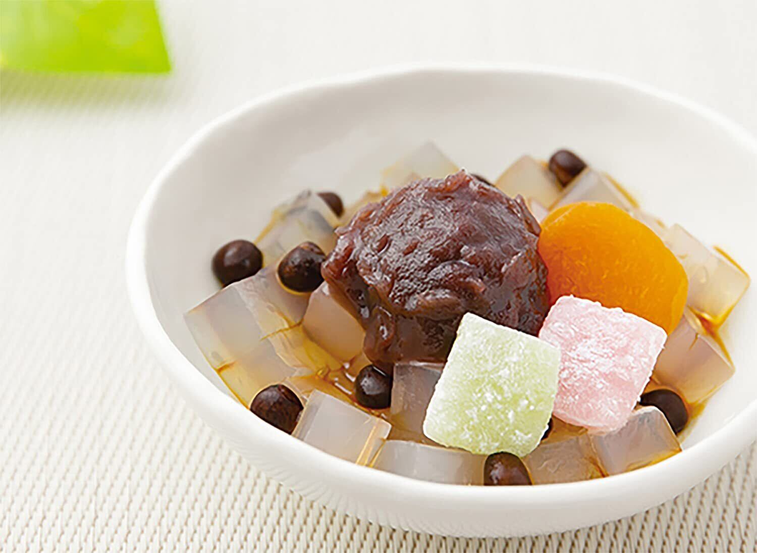 【寒天】寒天(国内製造)、醸造酢、天草(国産)【餡】砂糖)国内製造)、小豆【黒蜜】水あめ(国内製造)、黒糖、果糖ぶどう糖液糖、糖みつ【ぎゅうひ】麦芽糖(国内製造)、マルトオリゴ糖、もち米粉、でん粉/トレハロース、加工でん粉、乳化剤、着色料(コチニール、クチナシ)、(一部に乳成分を含む)【乾燥あんず】あんず(トルコ酸)/酸化防止剤(二酸化イオウ)【塩茹で赤えん豆】赤えん豆(北海道産)、食塩、砂糖