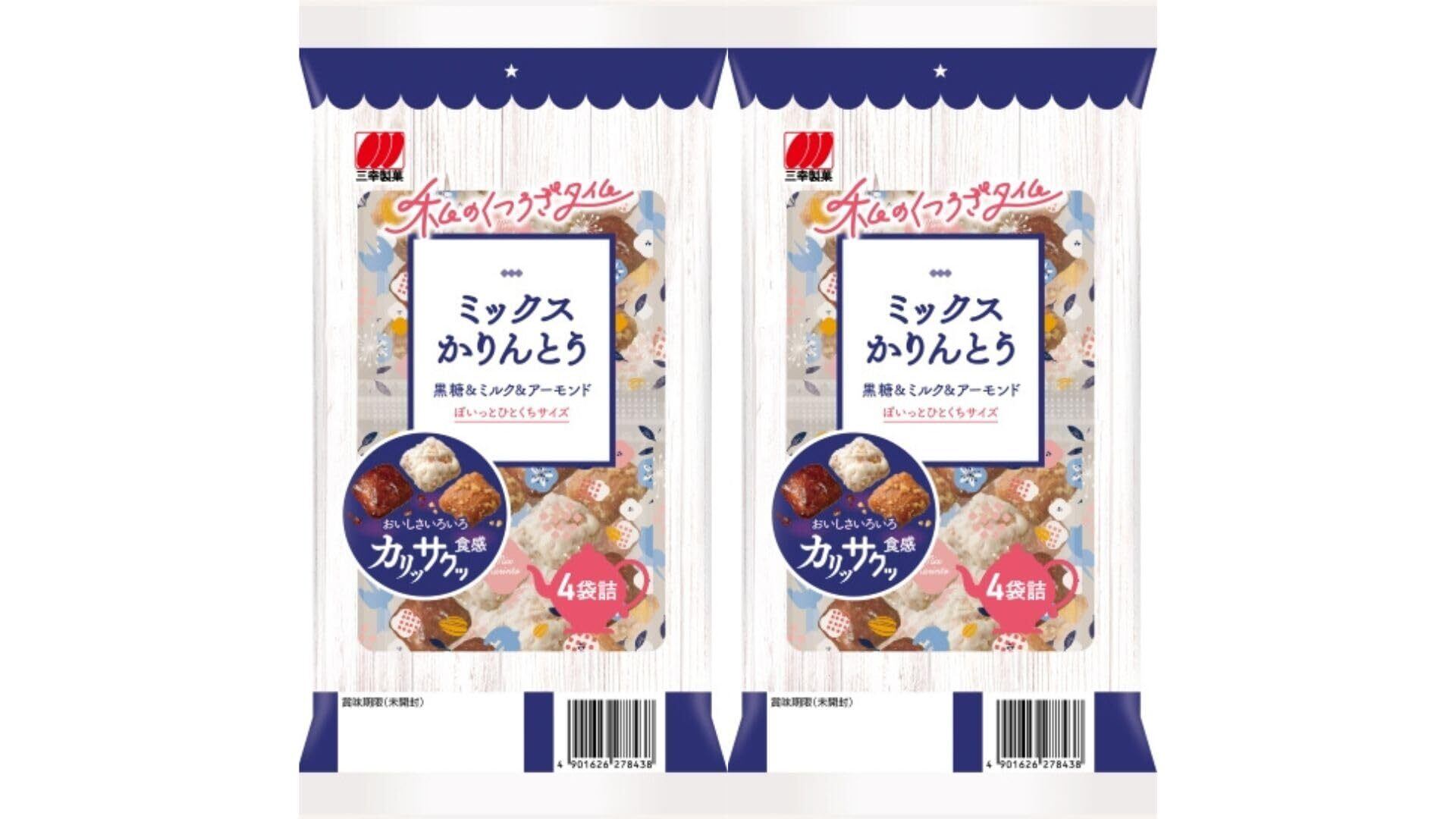 ひとくちかりんとうミックス 黒糖・ミルク・アーモンドの3つの味わいがお楽しみいただけます。ついつい持ち運びたくなる、便利な小分け包装4袋入り。