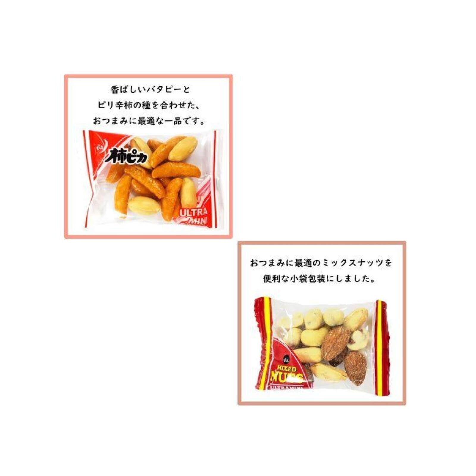 原材料・成分 【柿ピカ】ピーナッツ(中国),澱粉,米,しょう油,食物油脂,砂糖,デキストリン,食塩,かつおエキス,香辛料/加工でん粉,調味料(アミノ酸等),着色料(カラメル,カロチノイド,紅麹),香辛料抽出物,(一部に小麦・落花生・大豆を含む) 【スパイス】ピーナッツ(輸入),小麦粉,砂糖,澱粉,しょう油,寒梅粉,デキストリン,のり,食塩,ブドウ糖,香辛料,はちみつ,酵母エキス/加工でん粉,膨張剤,調味料(アミノ酸等),糊料(プルラン),香料,(一部に小麦・落花生・大豆を含む) 【しお味】ピーナッツ(輸入),小麦粉,砂糖,澱粉,植物油脂,寒梅粉,食塩,酵母エキス,蛋白加水分解物/膨張剤,糊料(プルラン),調味料(アミノ酸等),香料,(一部に小麦・落花生・ごまを含む) 【4種のチーズ味】ピーナッツ(輸入),小麦粉,砂糖,澱粉,しょう油,チーズシーズニング,寒梅粉,澱粉分解物,デキストリン,醸造調味料,食塩,酵母エキス,植物油脂,かつおエキス/調味料(アミノ酸等),加工でん粉,膨張剤,香料,着色料(カラメル),乳化剤,糊料(プルラン),甘味料(スクラロース),くん液,(一部乳成分・小麦・落花生・大豆を含む) 【ミックスナッツ】ピーナッツ(輸入),アーモンド,カシューナッツ,小麦粉,植物油脂,砂糖,澱粉,食塩,寒梅粉,酵母エキス,蛋白加水分解物,ブドウ糖,デキストリン,乳糖,ホエイパウダー,チーズパウダー,香辛料,脱脂粉乳,肉エキスパウダー,レモン果汁パウダー,粉末酢/膨張剤,調味料(アミノ酸等),糊料(プルラン),くん液,香料,酸味料,(一部に乳成分・小麦・落花生・アーモンド・カシューナッツ・ごま・大豆・鶏肉を含む) 【ピー海苔】ピーナッツ(中国),もち米,しょう油,植物油脂,のり,砂糖,食塩,澱粉,デキストリン,香辛料,風味調味料,蛋白加水分解物/調味料(アミノ酸等),着色料(カラメル,カロチノイド),香辛料抽出物,(一部に小麦・落花生・大豆を含む) 【粒もチーズ&黒胡椒豆】ピーナッツ(輸入),澱粉,小麦粉,米,もち米,砂糖,植物油脂,香辛料,チーズシーズニング,寒梅粉,食塩/加工でん粉,調味料(アミノ酸等),膨張剤,香料,香辛料抽出物,糊料(プルラン),着色料(カロチノイド),酸味料,(一部に乳成分・小麦・落花生・ごか・大豆・豚肉を含む) 【つぶ餅ピー小魚入り】ピーナッツ(中国),澱粉,米,片口いわし,しょう油,砂糖,植物油脂,デキストリン,食塩,ごま,香辛料,発酵調味料,みりん/加工でん粉,着色料(カラメル,紅麹,カロチノイド),調味料(アミノ酸等),トレハロース,香辛料抽出物,(一部に小麦・落花生・ごま・大豆を含む)