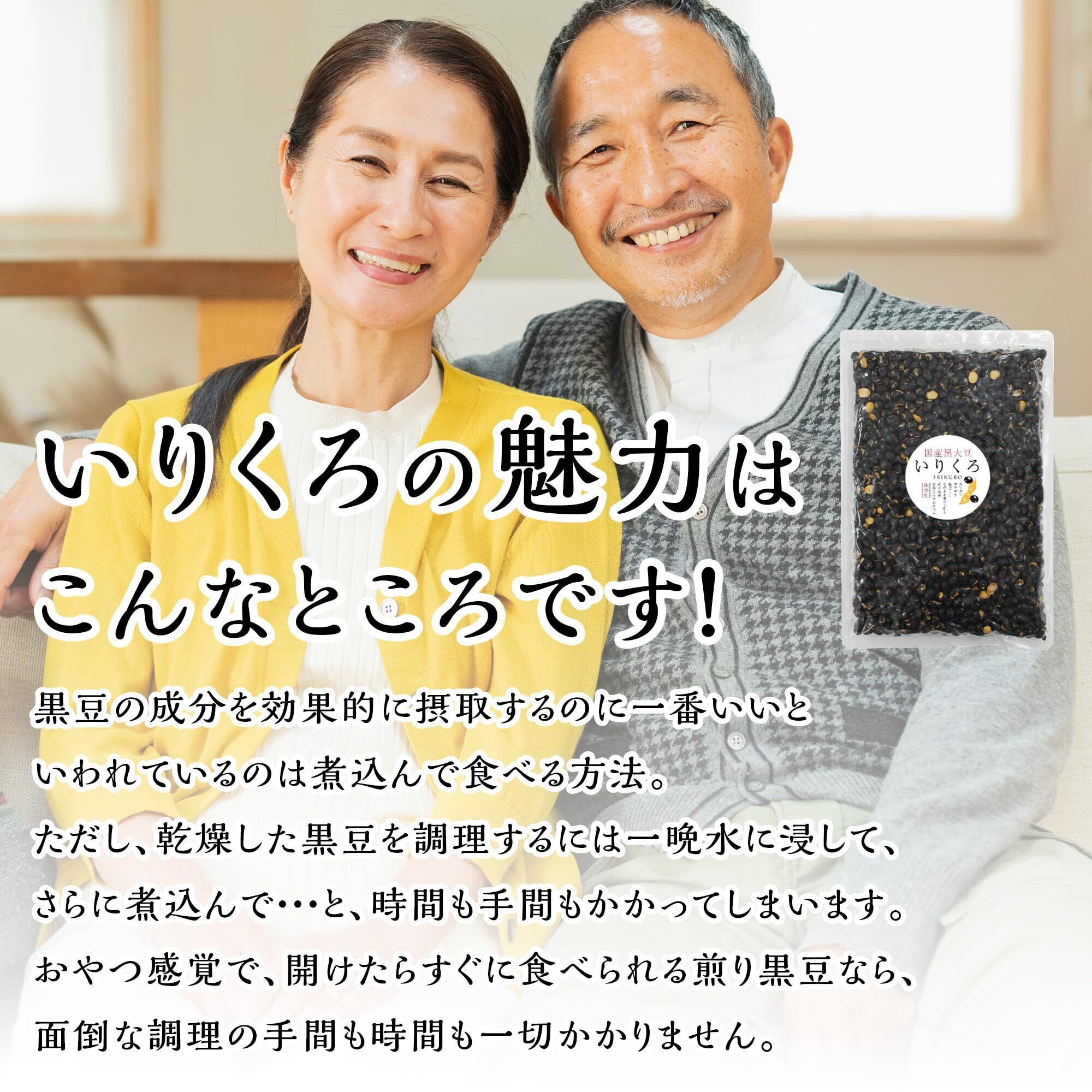 当社のいりくろは、北海道産の安心安全な黒豆を使用しています。おやつ感覚で手軽に摂取できるだけでなく、栄養価も満点です。ちょっと小腹が空いたときや、お子さんのおやつとして、またはお茶請けとしても最適です。手間いらずで、いつでも美味しくお召し上がりいただけます。豊富な栄養素と美味しさを兼ね備えたこの製品は、健康に配慮しながらも味わい深いスナックとして、おすすめです。日常の忙しい時間でも、栄養補給とお茶の美味しさを手軽に楽しめます。