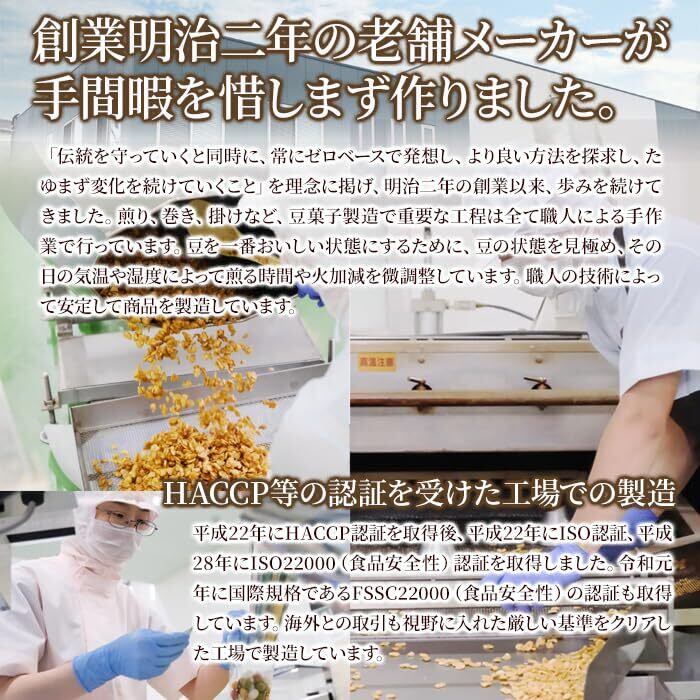 【安心の国内製造】明治二年創業の老舗メーカーが製造!豆菓子製造の重要な工程は全て職人による手作業で行っています。HACCP認証などを受けた工場で製造しています。
