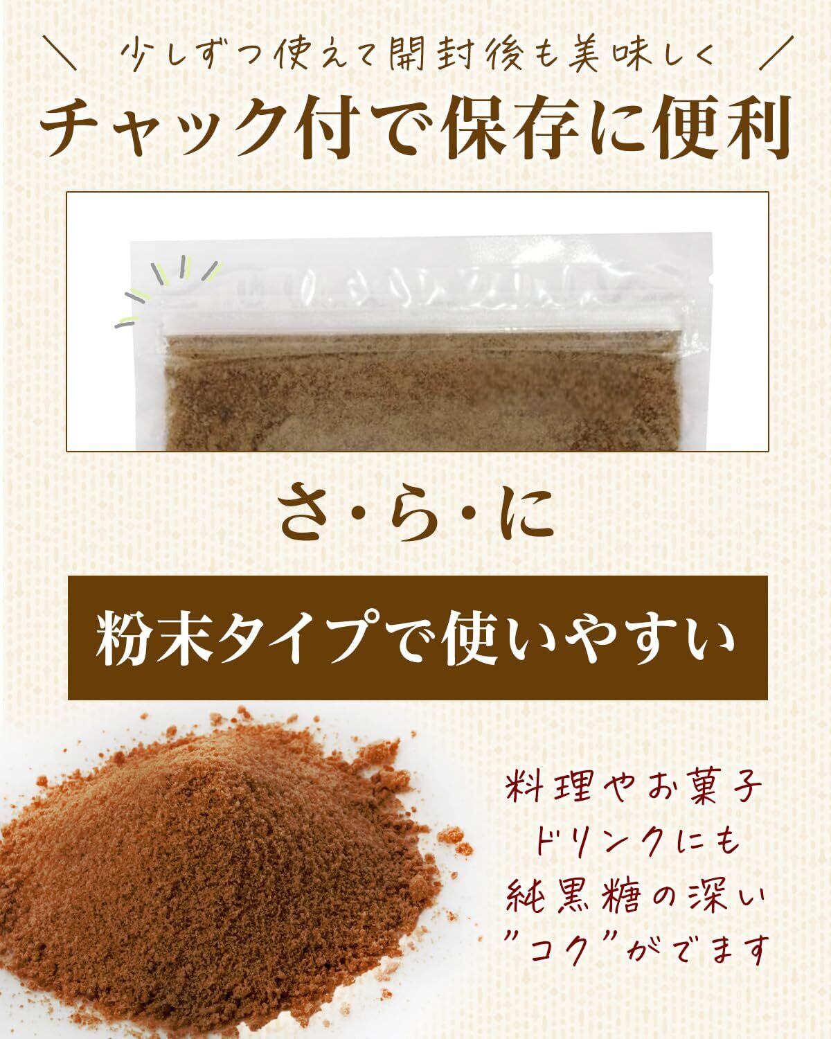 ブロックではなく粉末タイプなので、飲み物にさっと溶けやすく、お菓子作りや煮物にも便利。 波照間島産純黒糖のやさしい甘さが広がります。