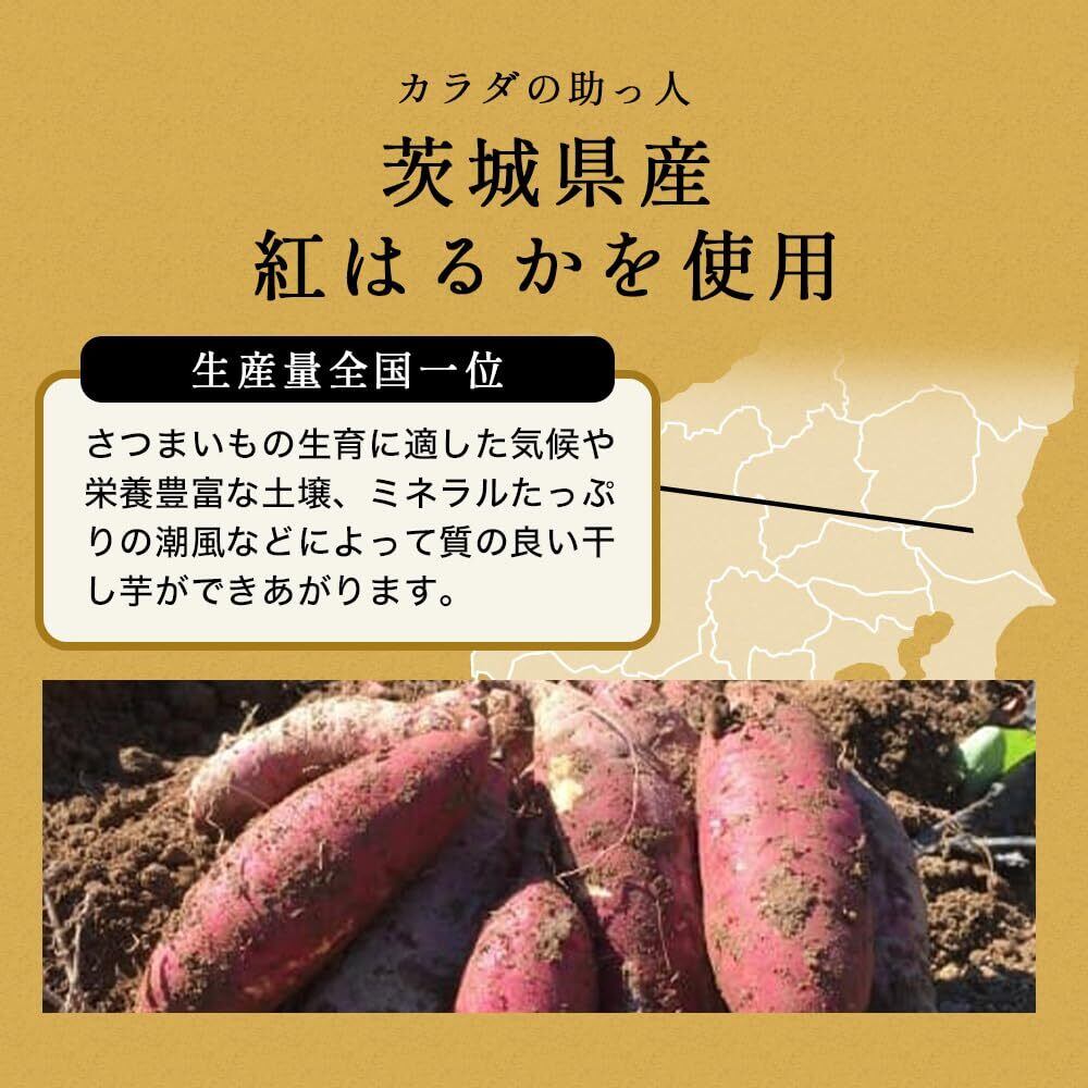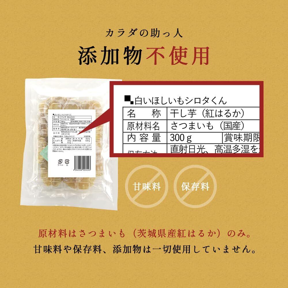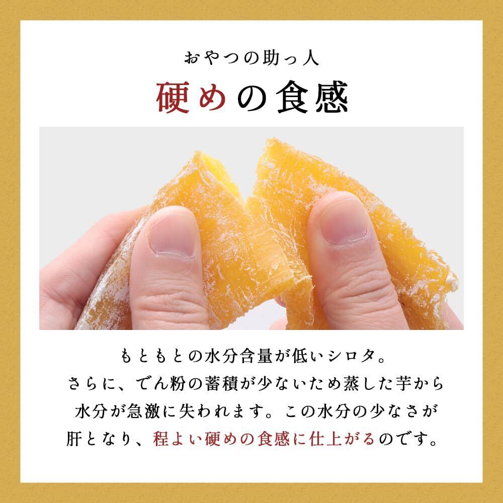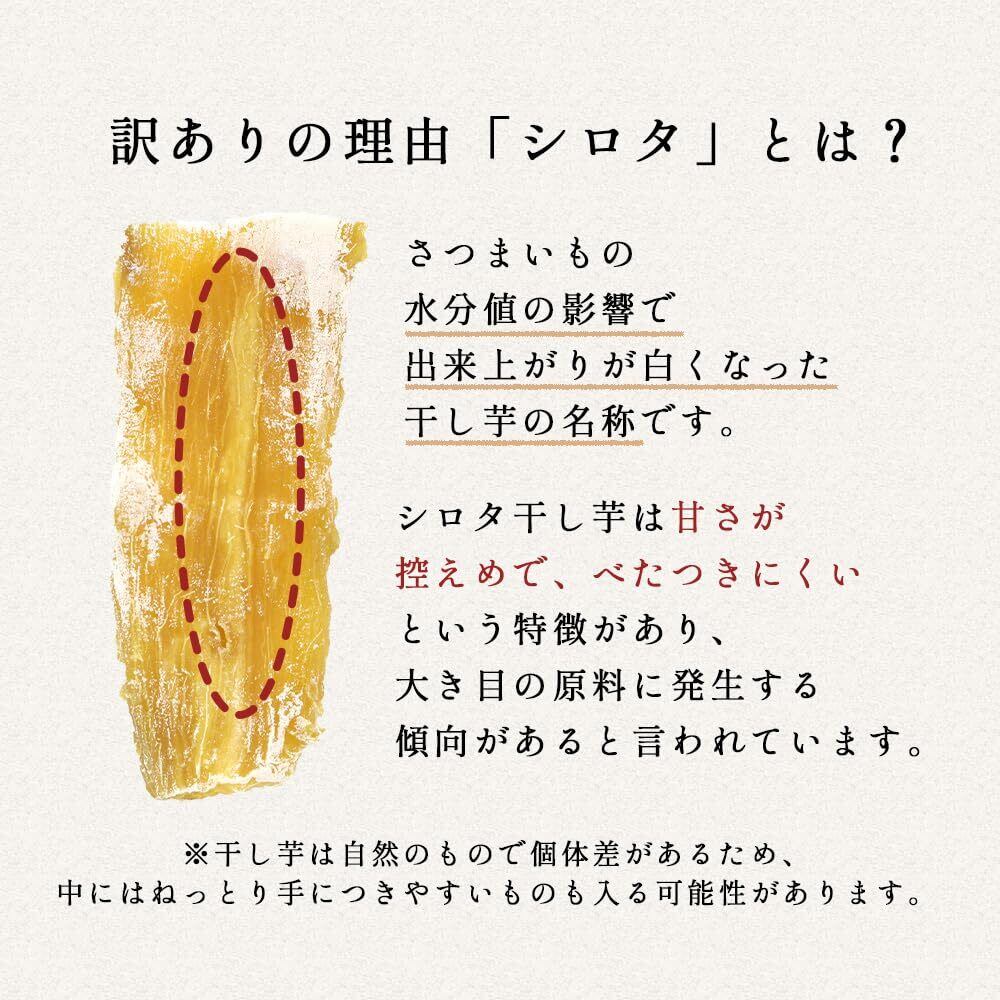 【シロタ干し芋とは?】さつまいもの水分値の影響で出来上がりが白くなった干し芋の名称です。シロタ干し芋は甘さが控えめで、べたつきにくいという特徴があり、大きめの原料に発生する傾向があると言われています。干し芋は自然のもので個体差があるため、中にはねっとり手につきやすいものも入る可能性があります。食物繊維やカリウムをはじめ、ビタミンE、ビタミンC、鉄等健康や美容に嬉しい栄養素が豊富に含まれています。【手につきにくい干し芋】シロタが発生する部分はでん粉が少なく粘性が弱いため、手につきにくいのです。干し芋特有のねっとりとした感じが少ないため、「ベタベタした干し芋が苦手」という方におすすめです。オーブントースターで軽く焼くと、表面はカリっと中はホクホク。温めるだけでいつもとは違う食感をお楽しみいただけます。【硬めの食感・甘さ控えめ】もともとの水分含量が低いシロタ。さらにでん粉の蓄積が少ないため、蒸した芋から水分が急激に失われます。この水分の少なさが、程よい硬めの食感に仕上がります。干し芋の甘みは麦芽糖が主成分として含まれています。シロタはこの麦芽糖(でん粉)が少ないため、控えめな食べやすい甘さになっています。原材料はさつまいものみ。甘味料や保存料、添加物は一切使用していません。【こだわりの干し芋製造】生芋を蒸す工程から製品包装まで、衛生環境の整った工場で一貫して行っています。自社オリジナルの蒸し器、乾燥機を使用。生産量全国1位の茨城県産紅はるかを使用。さつまいもの生育に適した気候や栄養豊富な土壌、ミネラルたっぷりの潮風などによって質の良い干し芋ができあたがります。
