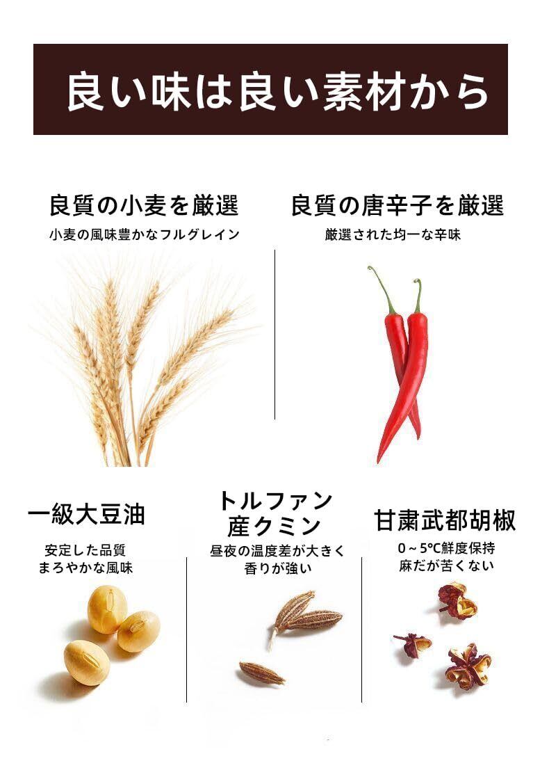 【良い味は良い素材から生まれるという安心感】厳選された良質の小麦、フルグレイン、小麦の風味、強い小麦の風味をもたらす。良質な唐辛子を厳選、均一な辛味。一級大豆油、まろやかな風味。トルファン産高級クミン、昼夜の温度差が大きく、香りが強い。甘粛省の武都胡椒、痺れるが苦くない。これらの上質な素材が、一口一口のおいしさをしている。