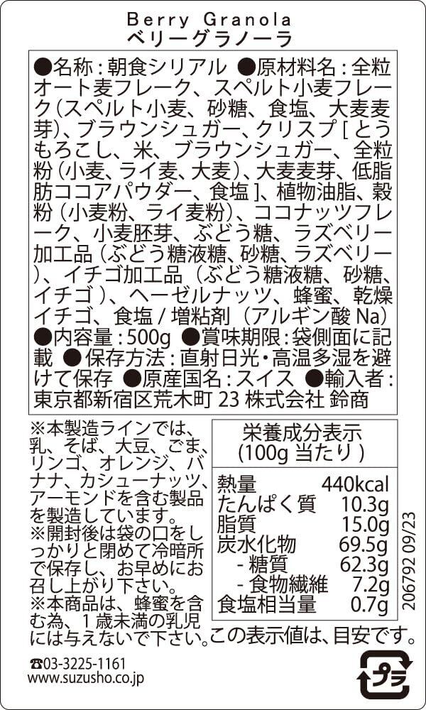 原材料:フレーク(オート麦、スペルト小麦)、粗糖、植物油、クリスプ(とうもろこし、米、大麦粉、大麦麦芽、ココアパウダー)、小麦粉、ライ麦粉、ココナッツフレーク、小麦胚芽、ぶどう糖、いちご、ラズベリー蜂蜜、へーゼルナッツ、食塩、砂糖、大麦麦芽、ぶどう糖液糖、マルトデキストリン、スターチ、乳化剤、増粘剤(アルギン酸Na)