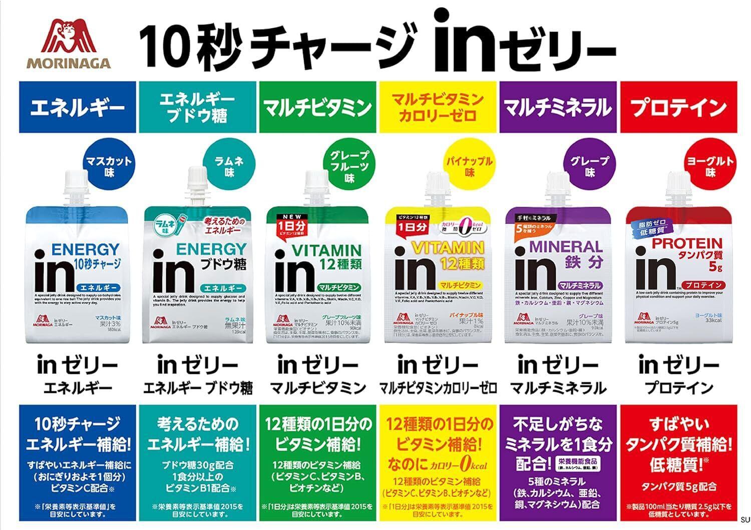 【プロテイン(タンパク質)を10秒チャージ】「inゼリー」シリーズはおいしく素早く目的のエネルギーや栄養素・水分を補給できる、飲むゼリータイプの栄養補助食品です。