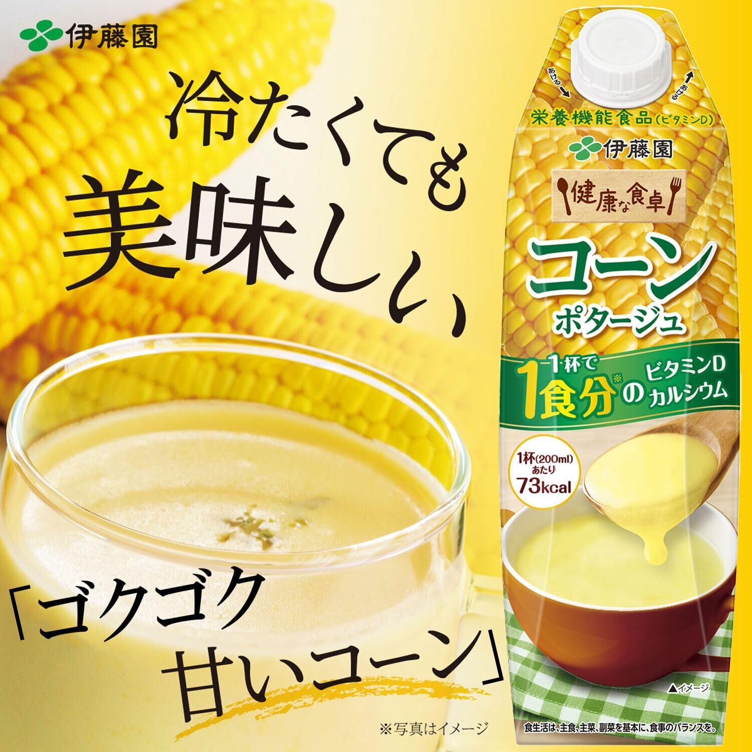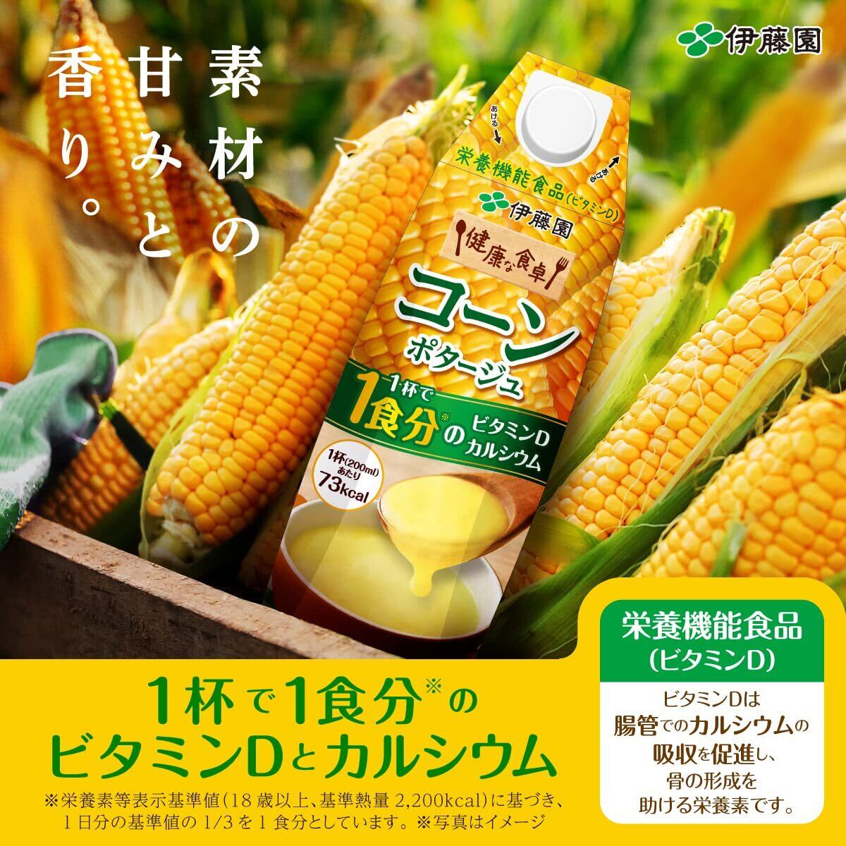 ●おいしく手軽に栄養を! 健康な食卓をサポートする栄養機能食品のコーンポタージュ【栄養のポイント】●1食分※のビタミンDとカルシウムで健康をサポート。(1杯あたり200ml)(ビタミンD:1.84~5.0μg/200ml、カルシウム:227mg/200ml)※栄養素等表示基準値(18歳以上、基準熱量2,200kcal)に基づき、1日分の基準値の1/3を1食分としています。● 栄養機能食品(ビタミンD)ビタミンDは、腸管でのカルシウムの吸収を促進し、骨の形成を助ける栄養素です。【おいしさのポイント】●フレッシュなコーンの甘みと香りを逃さずに詰め込んでいます。● 時間をかけて煮込んだような、コク深い味わいに仕上げました。香料・着色料、食用油脂を原料に使用せずに、手間暇かけて素材のおいしさを引き出し、濃度感のある味わいに仕上げました。キャップ付き容器なので開けやすく、注ぎやすく、衛生的です。■ご注意(アレルギー物質について)本品の原材料には、「乳成分」「鶏肉」が含まれておりますので、アレルギー体質の方は、お飲みにならないでください。■ご注意(栄養機能食品について)●本品は、多量摂取により疾病が治癒したり、より健康が増進するものではありません。1日の摂取目安量を守ってください。●摂取目安量:1日当たり200mlを目安にお飲みください。●1日当たりの栄養素等表示基準値(18歳以上、基準熱量2,200kcal)に占める割合:ビタミンD 33~90%(200ml当たり)●本品は、特定保健用食品と異なり、消費者庁長官による個別審査を受けたものではありません。 原材料・成分 ●原材料:スイートコーン(遺伝子組み換えではない)、砂糖、オニオンソテー、食塩、コーンペースト加工品、牛乳、チキンブイヨン調味料/増粘剤(加工でん粉)、炭酸カルシウム、調味料(アミノ酸)、乳化剤、ビタミンD、(一部に乳成分・鶏肉を含む)●原料原産地名:タイ又は日本(スイートコーン)