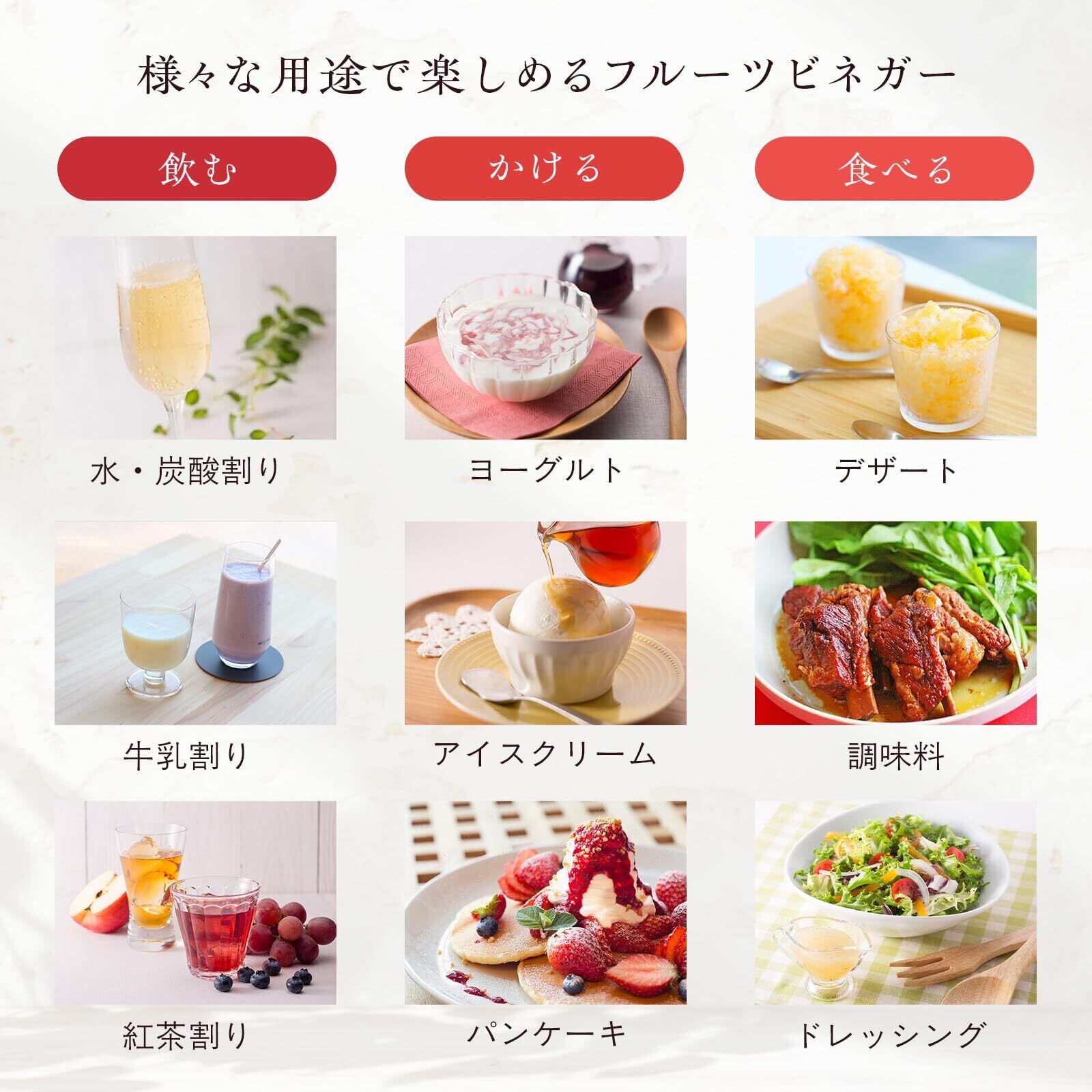 【フルーツビネガーで健康習慣を始めよう! 】本品は「疲れた時のリフレッシュに」「 ジュース の代わりに」「お食事と一緒に」などあらゆるシーンにおいて、フルーツビネガー ドリンク として楽しむことができます。あなたも楽しく健康習慣を始めませんか?