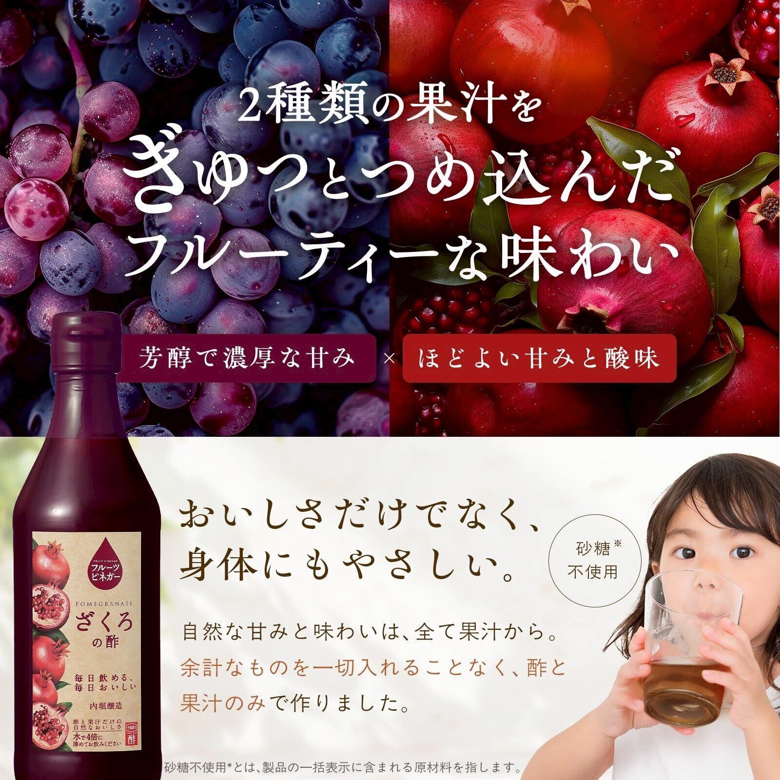 ・香りも甘みもすべて ぶどう と ざくろ の 果汁 由来。 無糖 なので、毎日の健康習慣に取り入れやすく、 飲む酢 を始めたい方にもおすすめです。