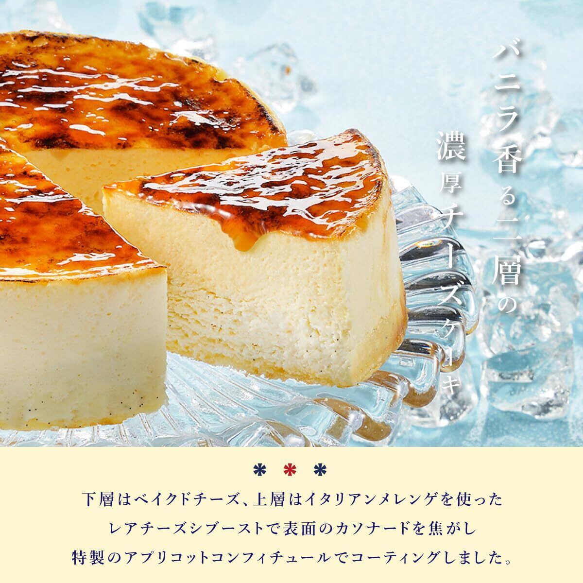 【2層で仕上げた驚きの味わい】下層はベイクドチーズ、上層はイタリアンメレンゲを使ったレアチーズシブー ストで 表⾯のカソナードを焦がし特製アプリコットのコンフィチュールで コーティングしました。ひと⼝⾷べ た瞬間、その味わいの深さにみんな笑顔になるチーズケーキです。